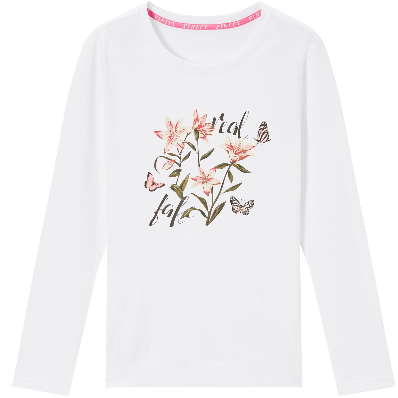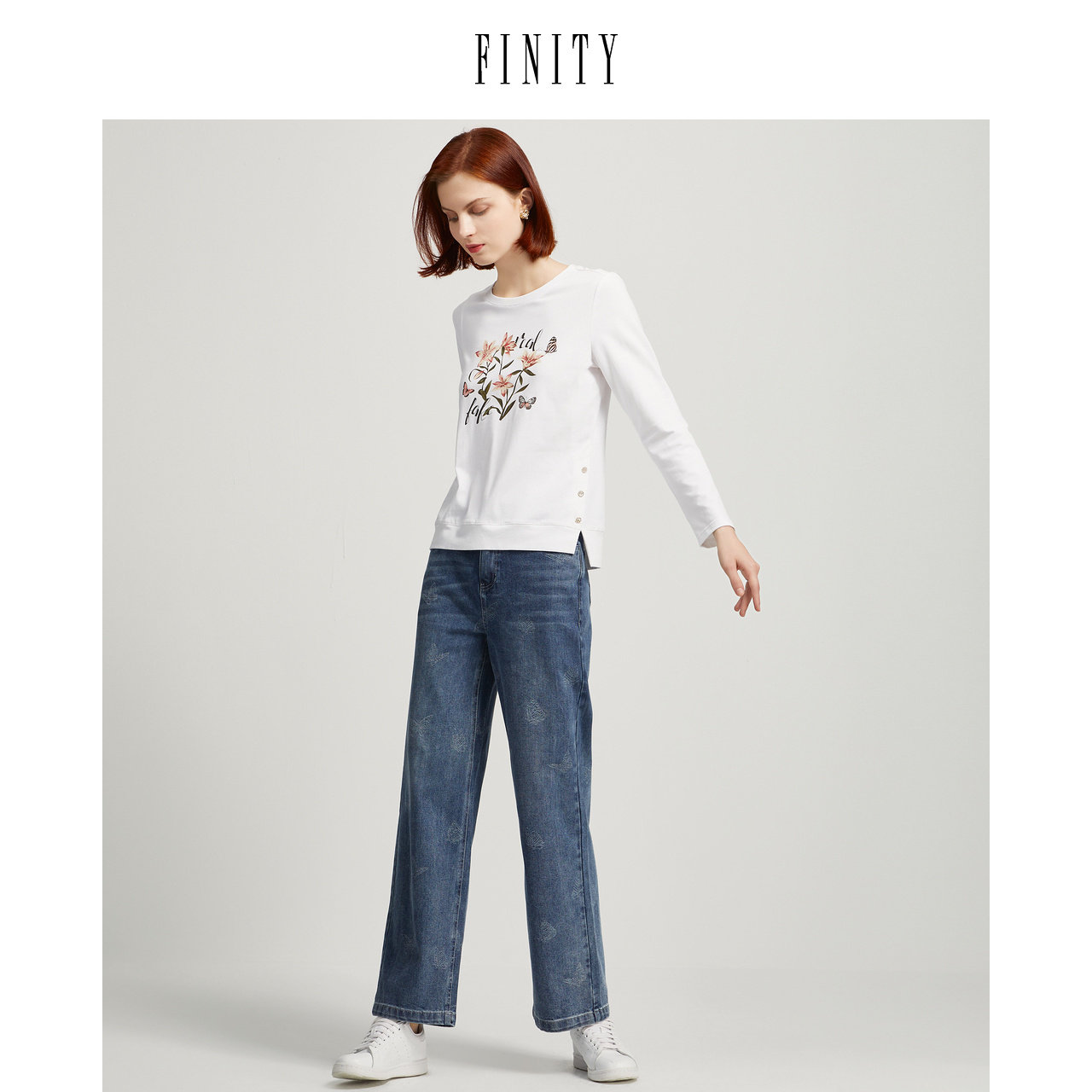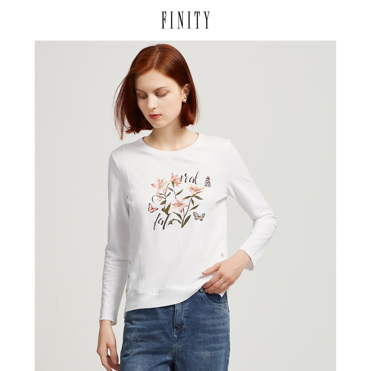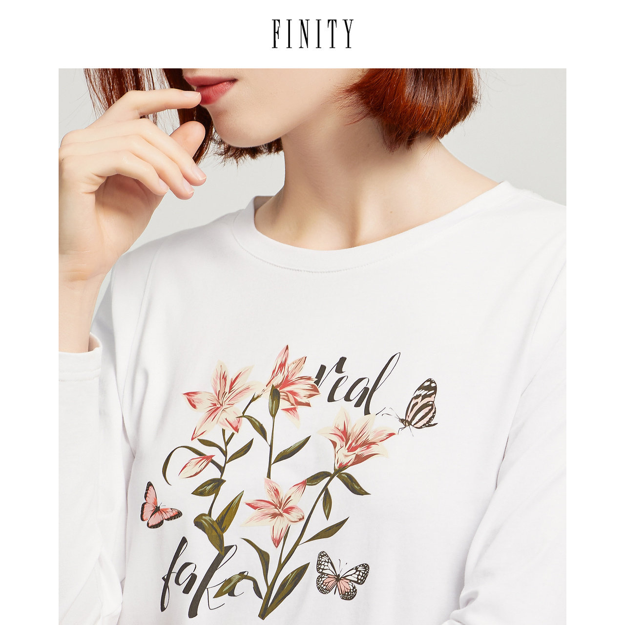 FINITY2025秋新款全棉T恤女印花白色长袖时尚气质宽松减龄上衣