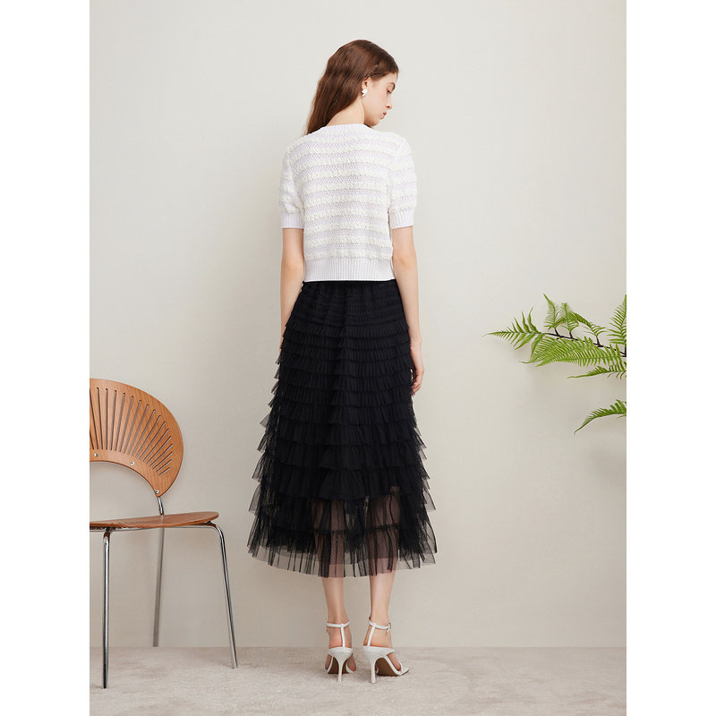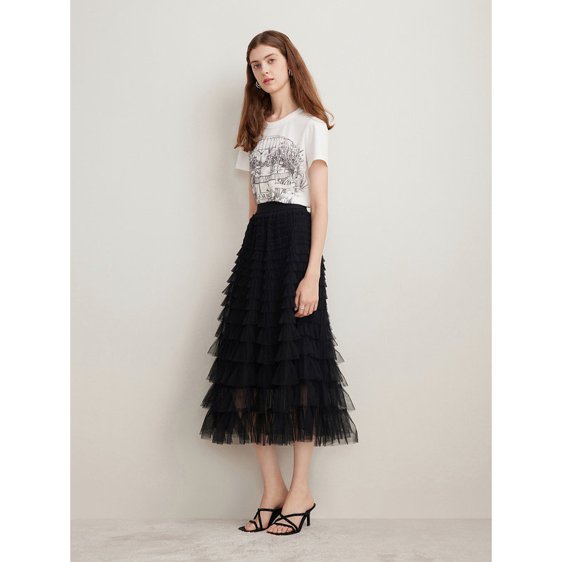 Goodland美地夏季A字压褶小黑裙网纱蛋糕半身裙