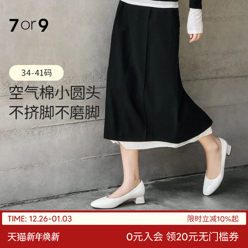 7or9女鞋白色高跟鞋秋冬新款大码漆皮粗跟通勤职业浅口单鞋黑贝果