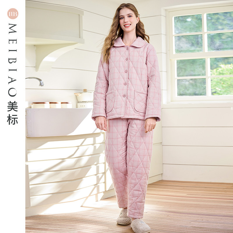 美标新款情侣三层加厚夹棉睡衣套装女秋冬纯棉全棉质格子家居服男