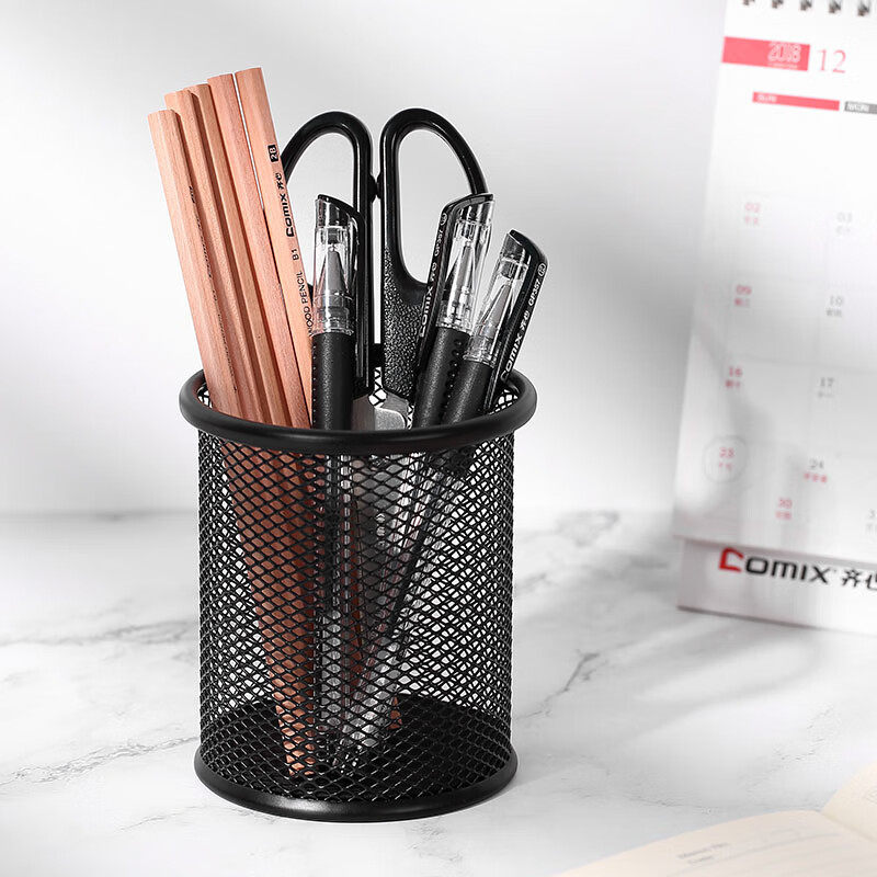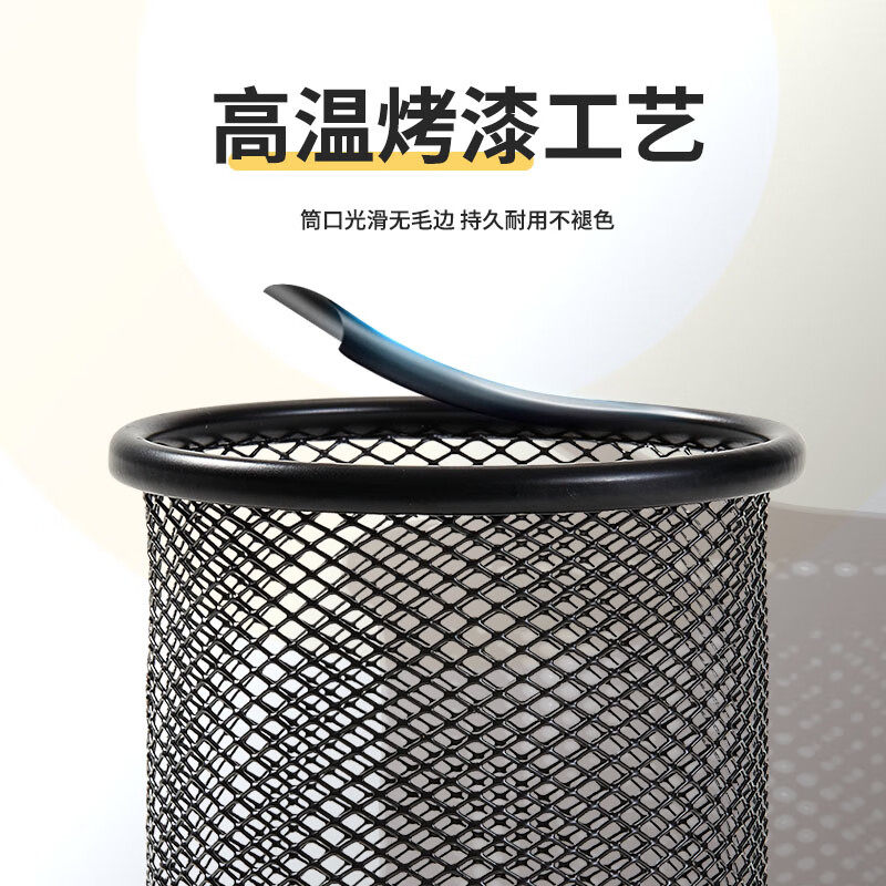 齐心金属笔筒网纹圆形笔筒黑色金属创意桌面收纳盒办公文具工具笔插商务笔类时尚笔盒大容量多功能办公用品