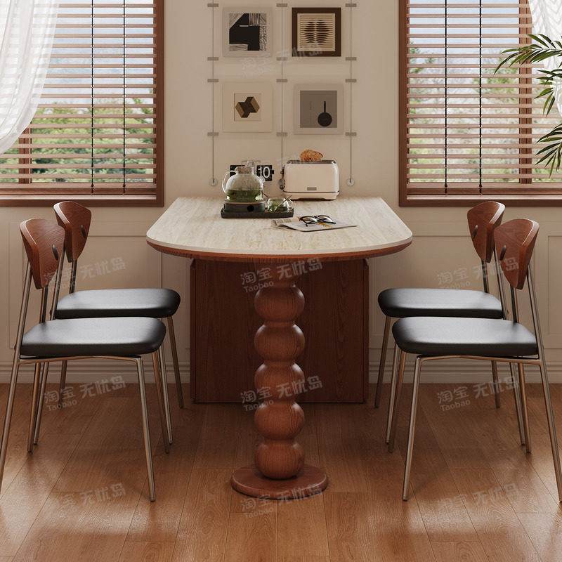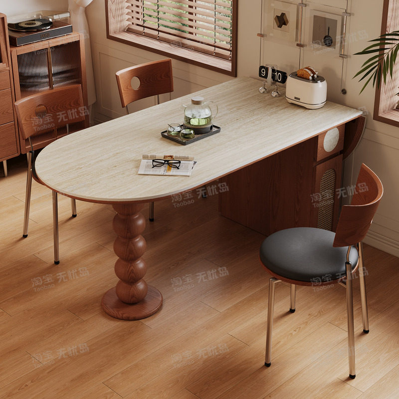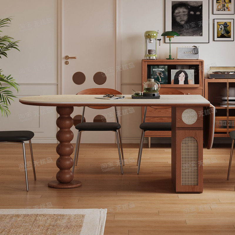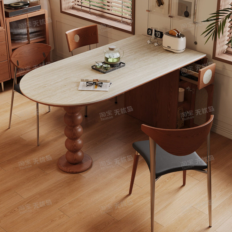 法式复古洞石岩板餐桌设计师椭圆形可折叠中古风小户型实木饭桌