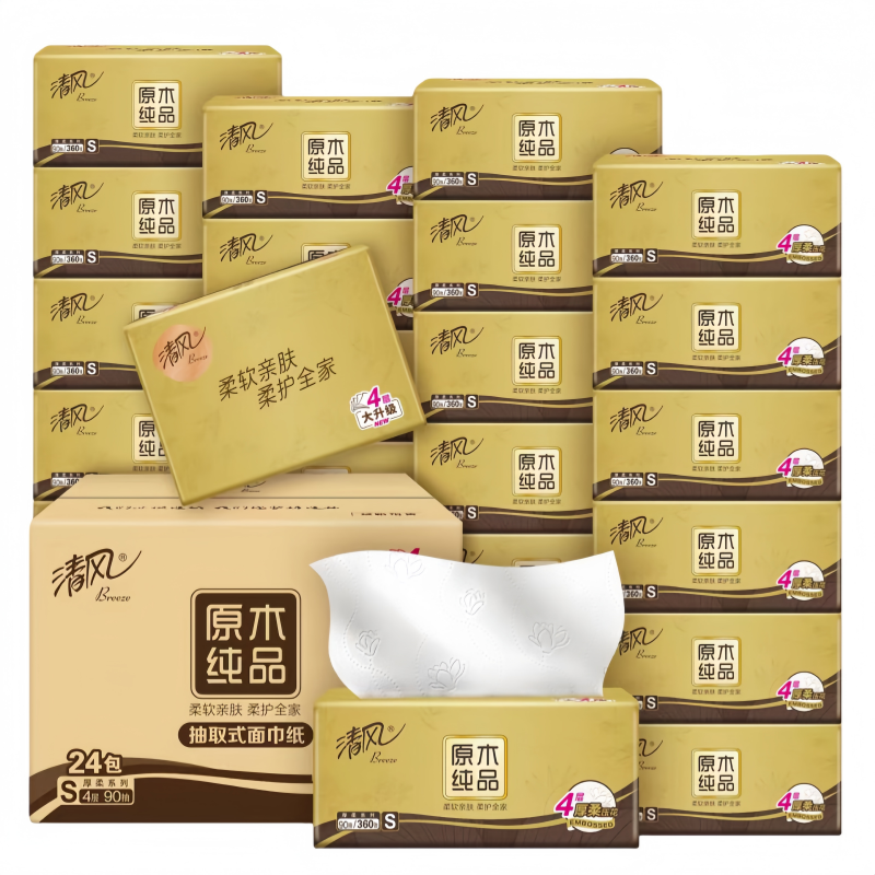 清风抽纸金装8包4层360张整提装家用纸巾餐巾纸母婴可用擦手纸