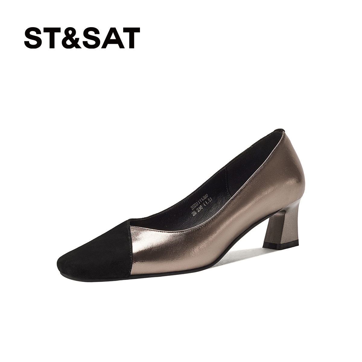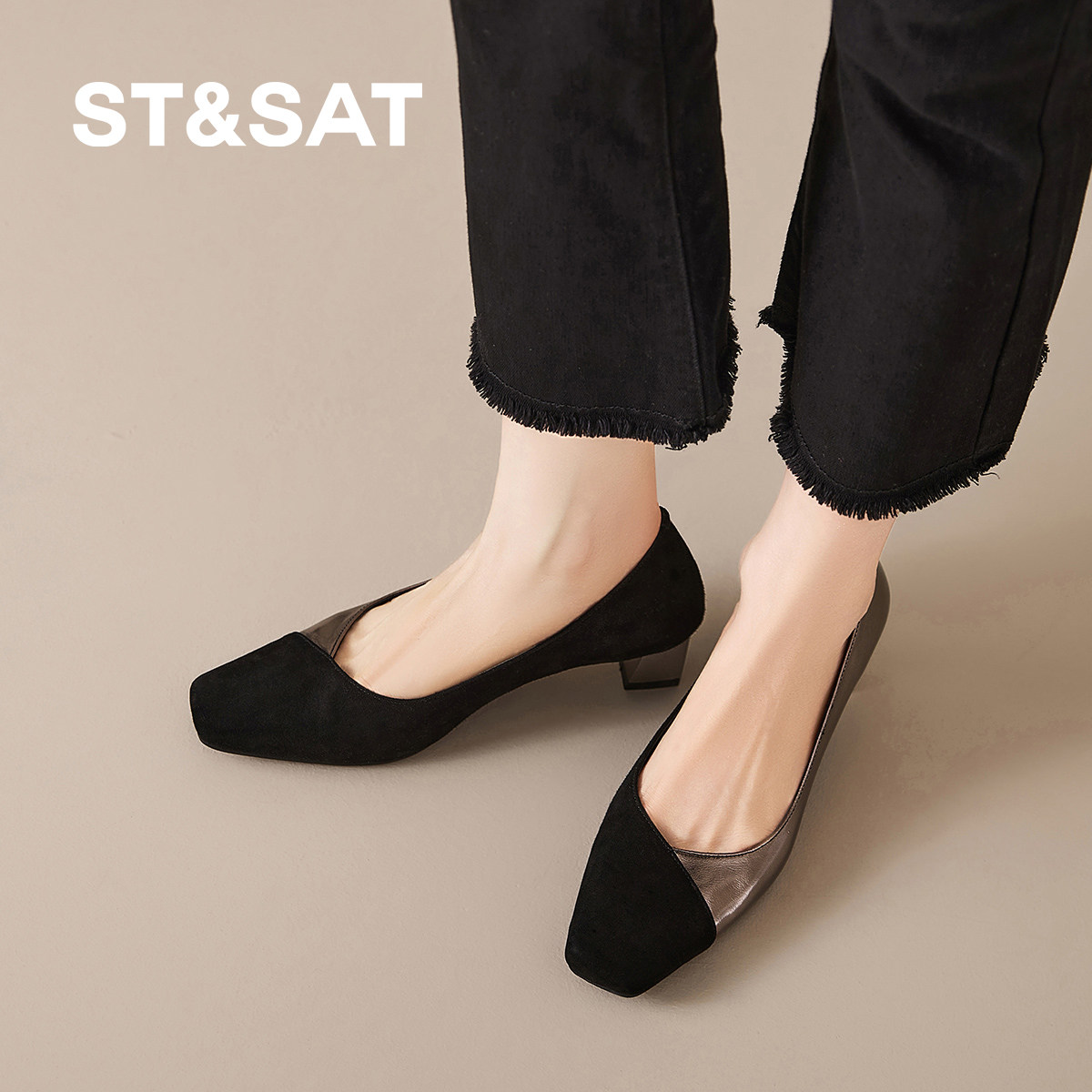 星期六法式拼色玛丽珍鞋2025新款方头浅口粗跟女单鞋通勤高跟鞋