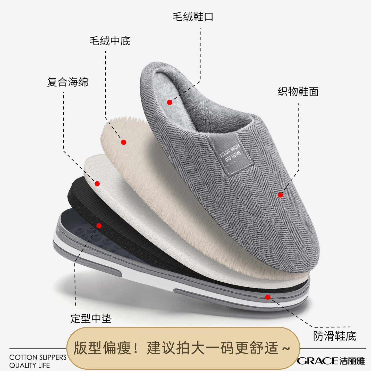 洁丽雅男士棉拖鞋冬季2025家居保暖加绒拖鞋女款防滑居家棉毛绒