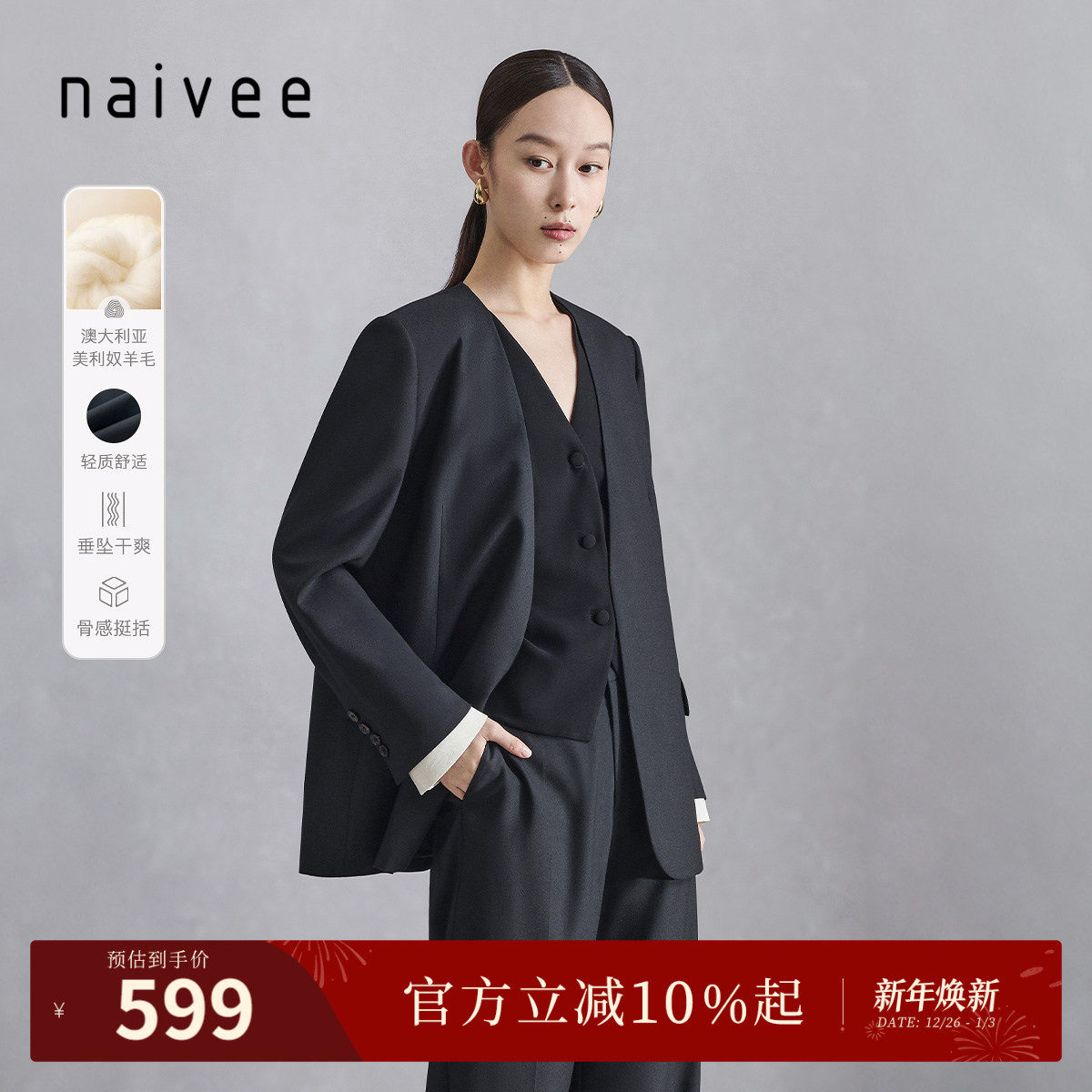 naivee纳薇秋通勤百搭H型水洗绵羊毛无领西装外套女