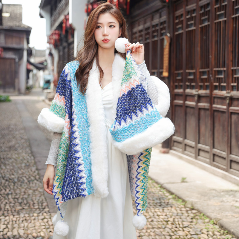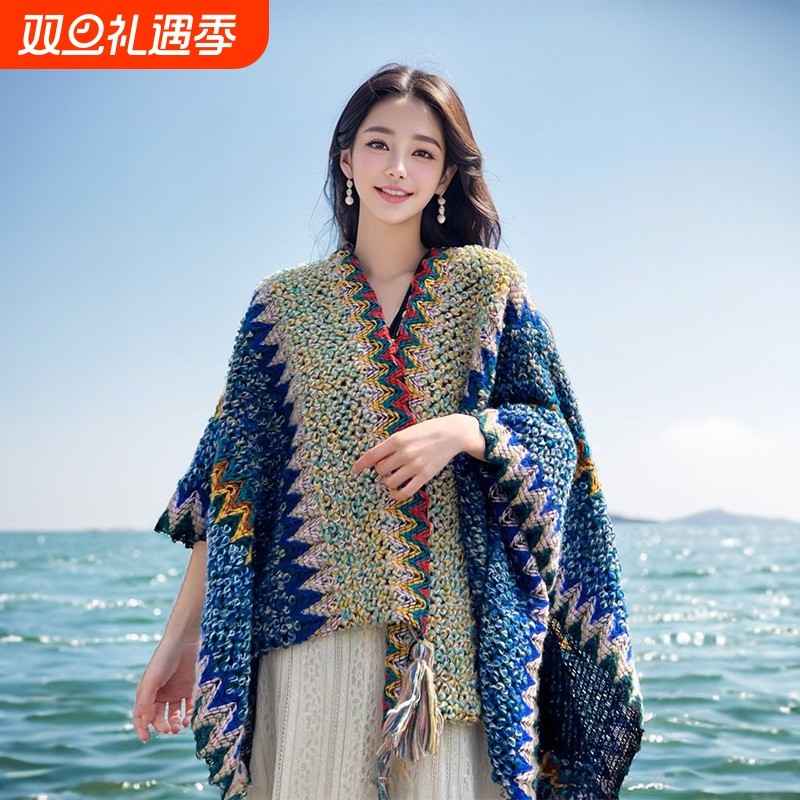 云南丽江民族风蓝色旅游披肩女外搭氛围感时尚披风斗篷针织围巾女