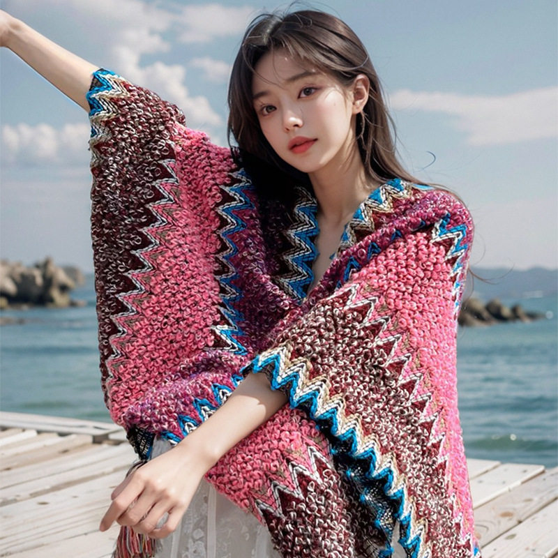 民族风旅游穿搭披肩围巾女外搭针织披风云南丽江波西米亚斗篷条纹
