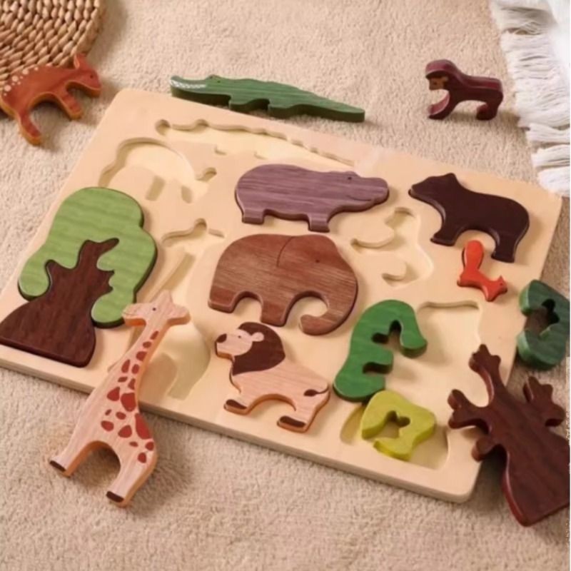 动物拼图手抓板嵌板早教益智积木配对认知木质拼图板堆叠儿童玩具