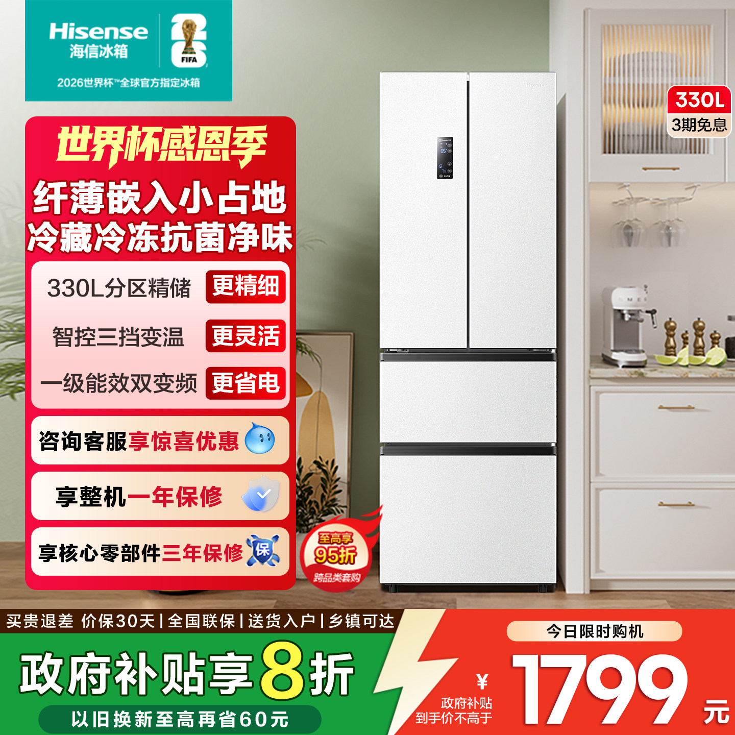 海信330L嵌入法式四门冰箱一级变频风冷无霜小型以旧换新补贴白色