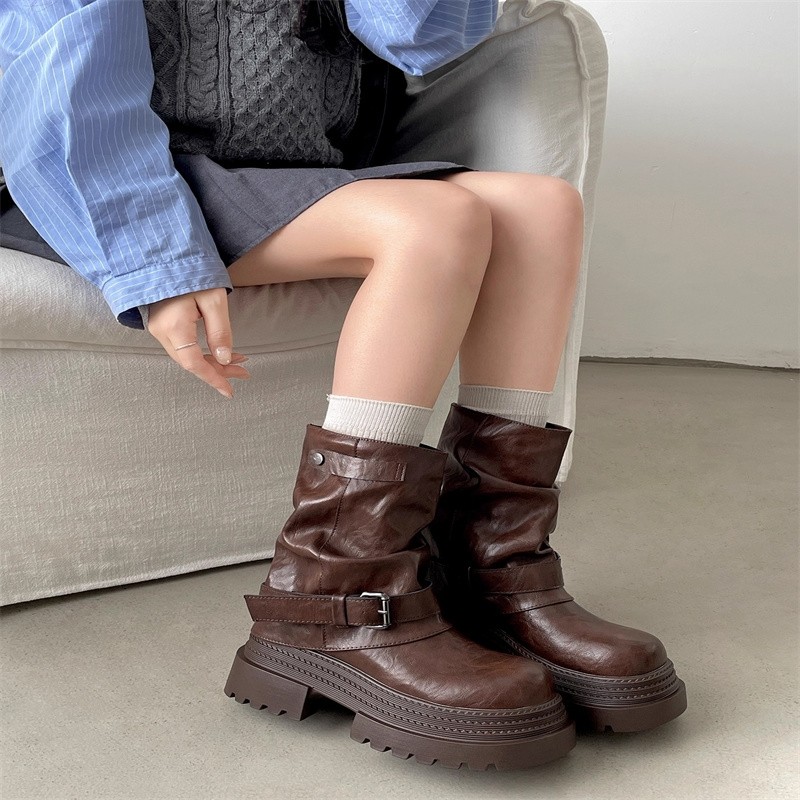 真皮~内增高西部牛仔堆堆靴女2025秋褶皱裤管短靴复古骑士马丁靴