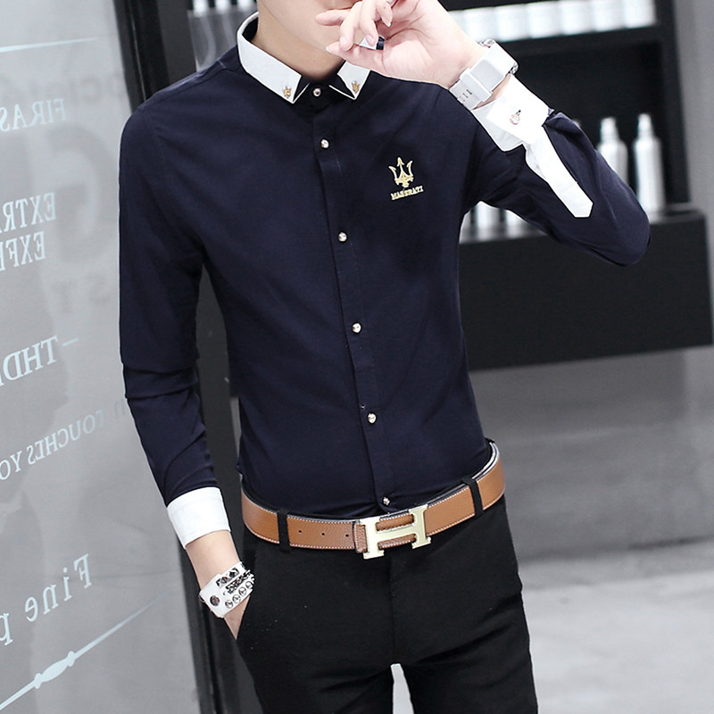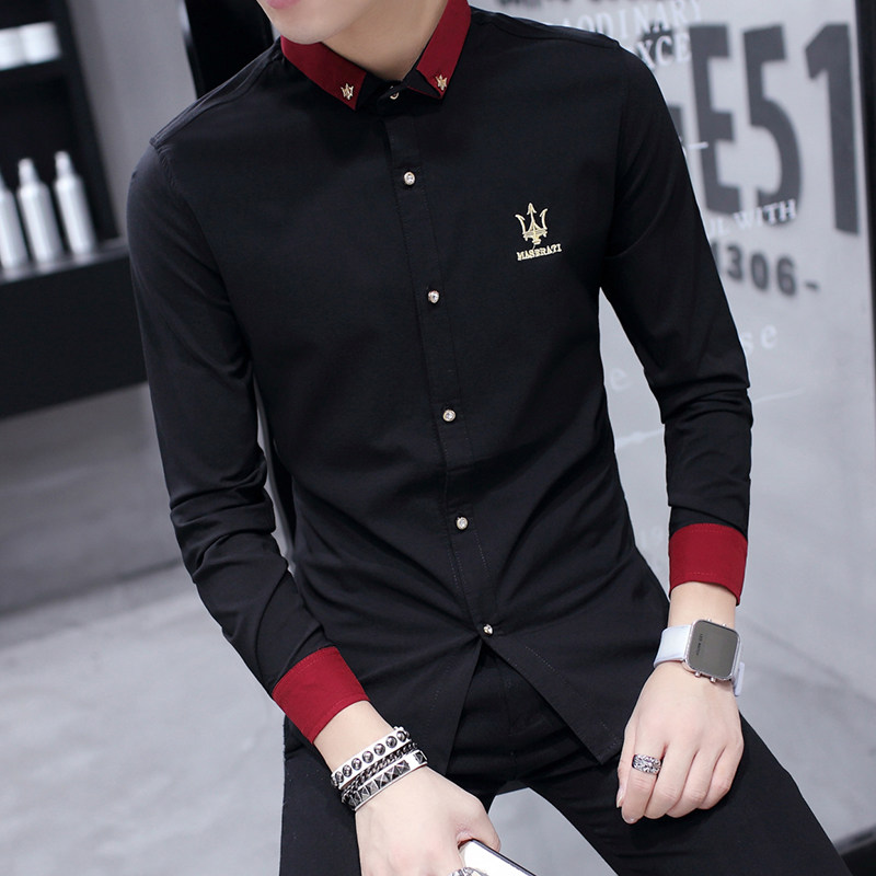 男士长袖衬衫男韩版秋季潮流帅气黑色衬衣修身上衣发型师休闲寸衫