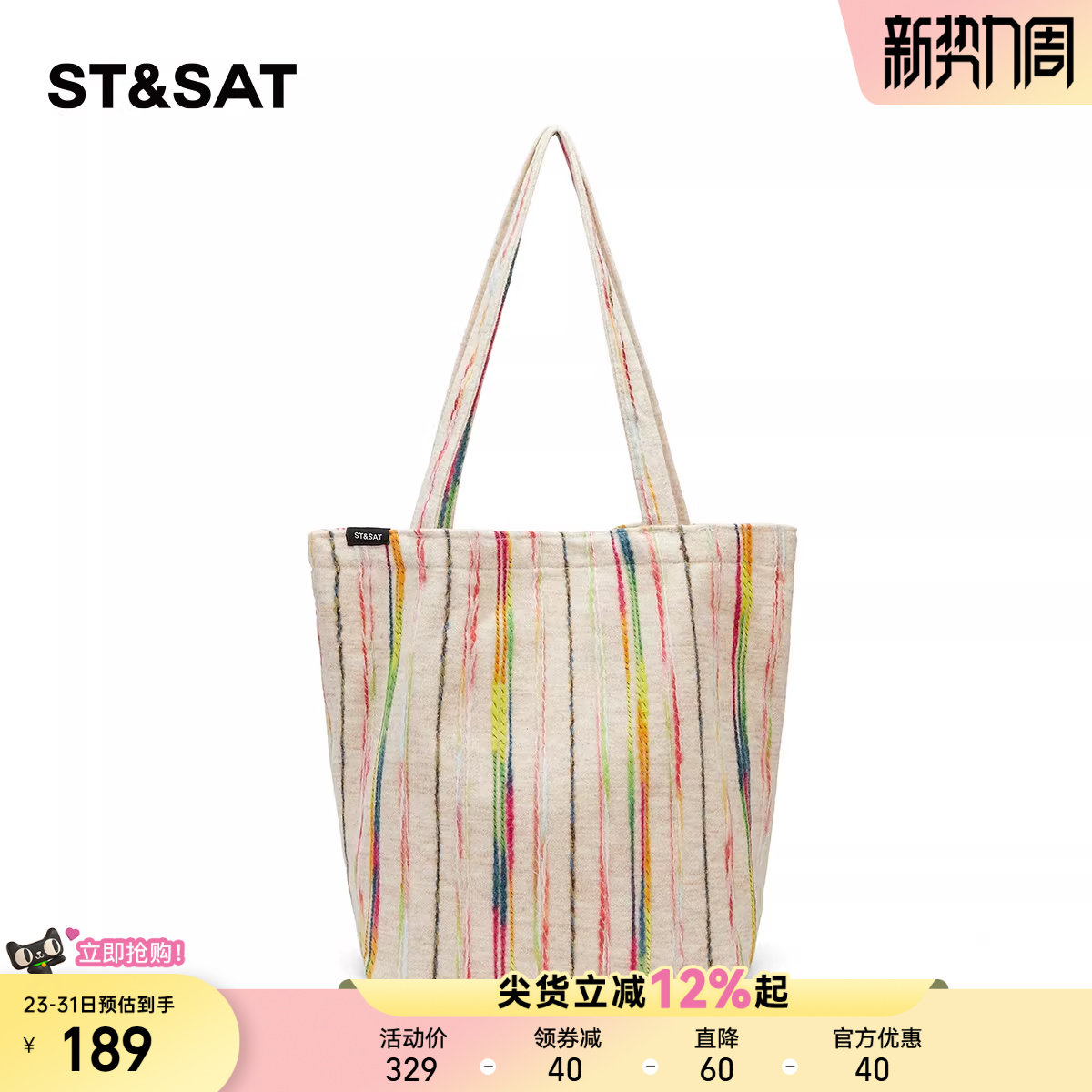 星期六彩虹条纹帆布托特包夏季新款单肩包立体刺绣手提包通勤女包