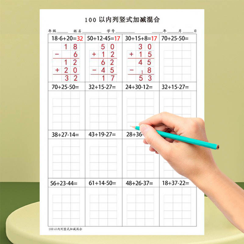 假期数学一天一练计算口算练习纸100以内加法减法连加连减加减混合全横式竖式一二三年级计算题天天练活页纸