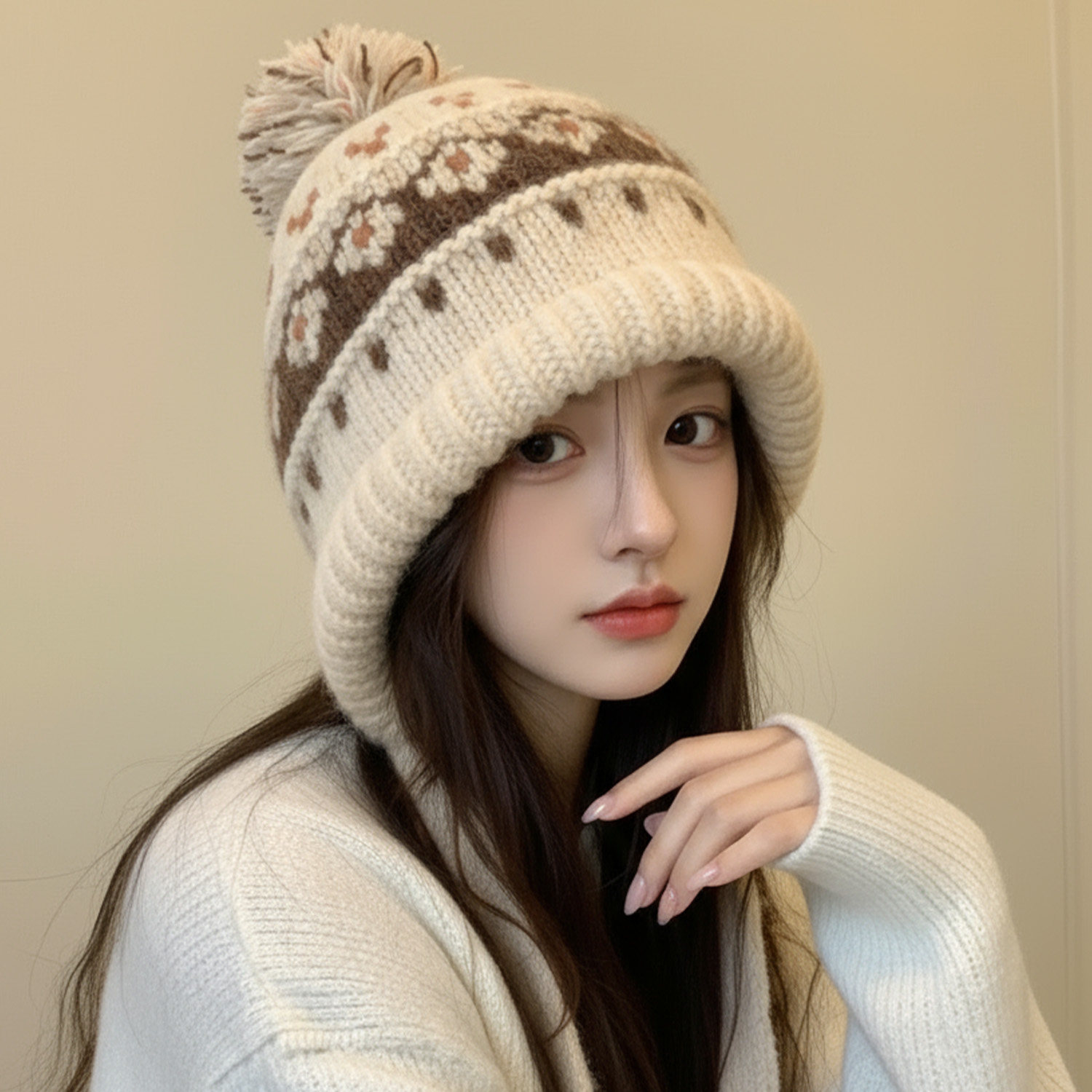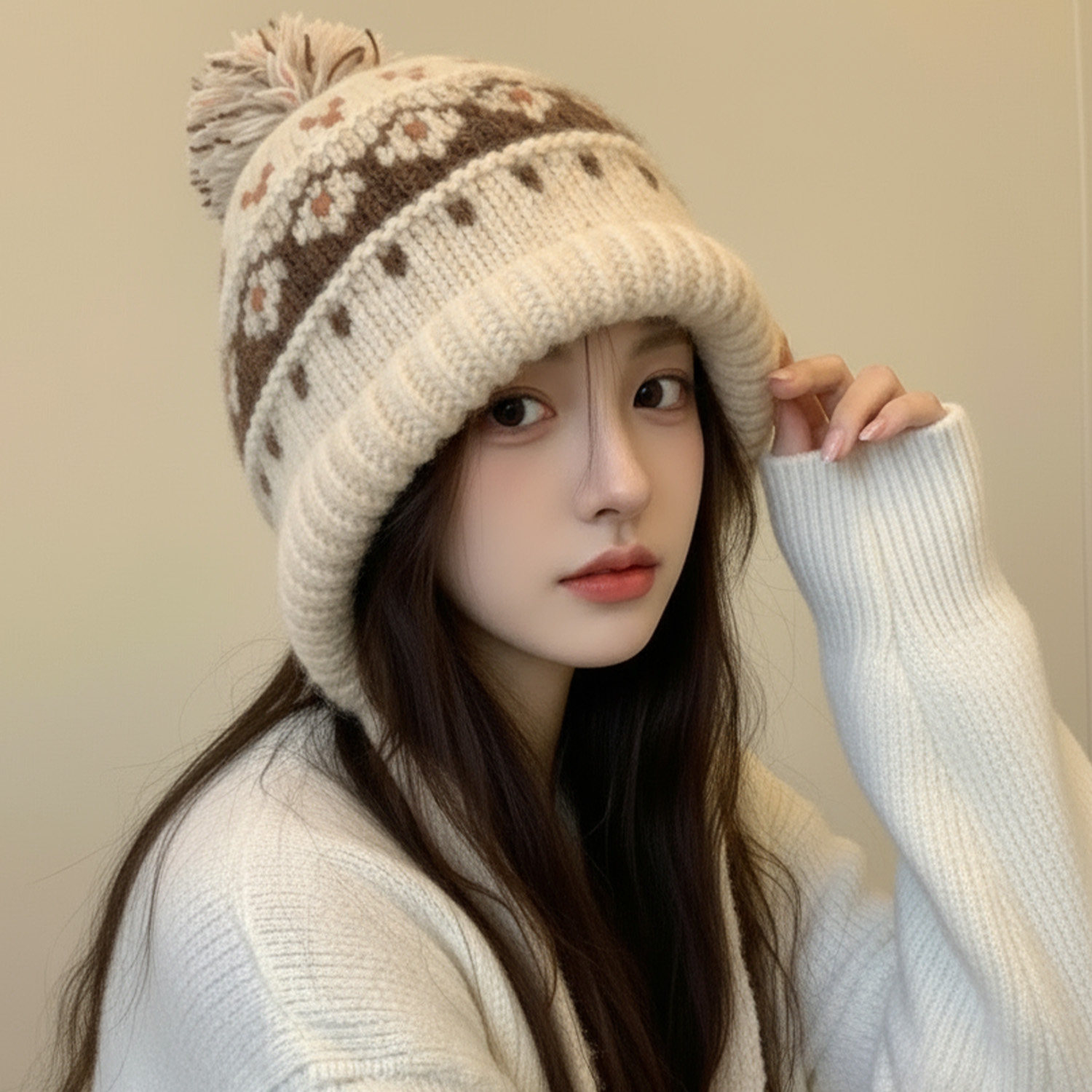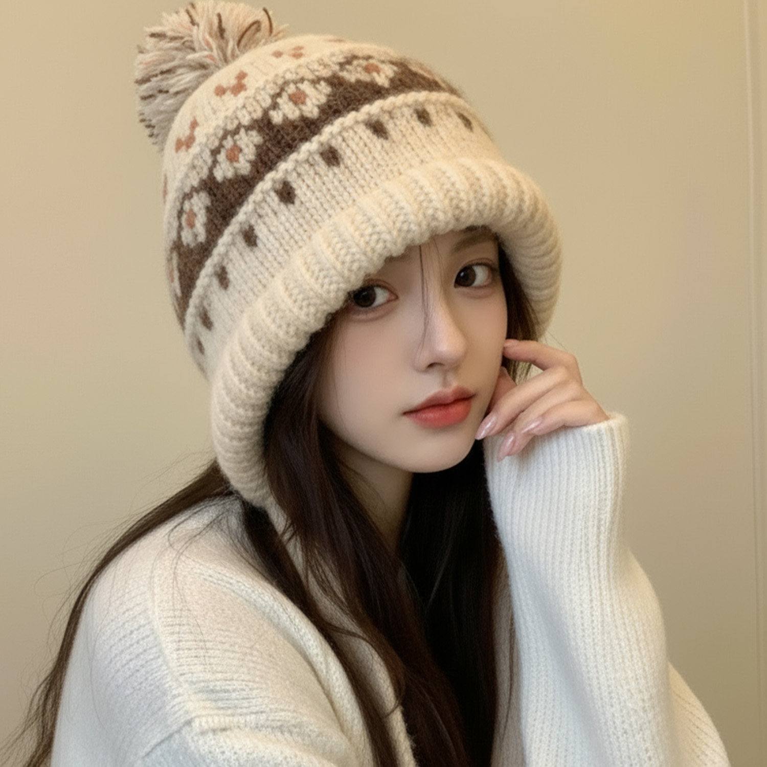 费尔岛毛线帽子,毛球点缀,复古保暖显脸小