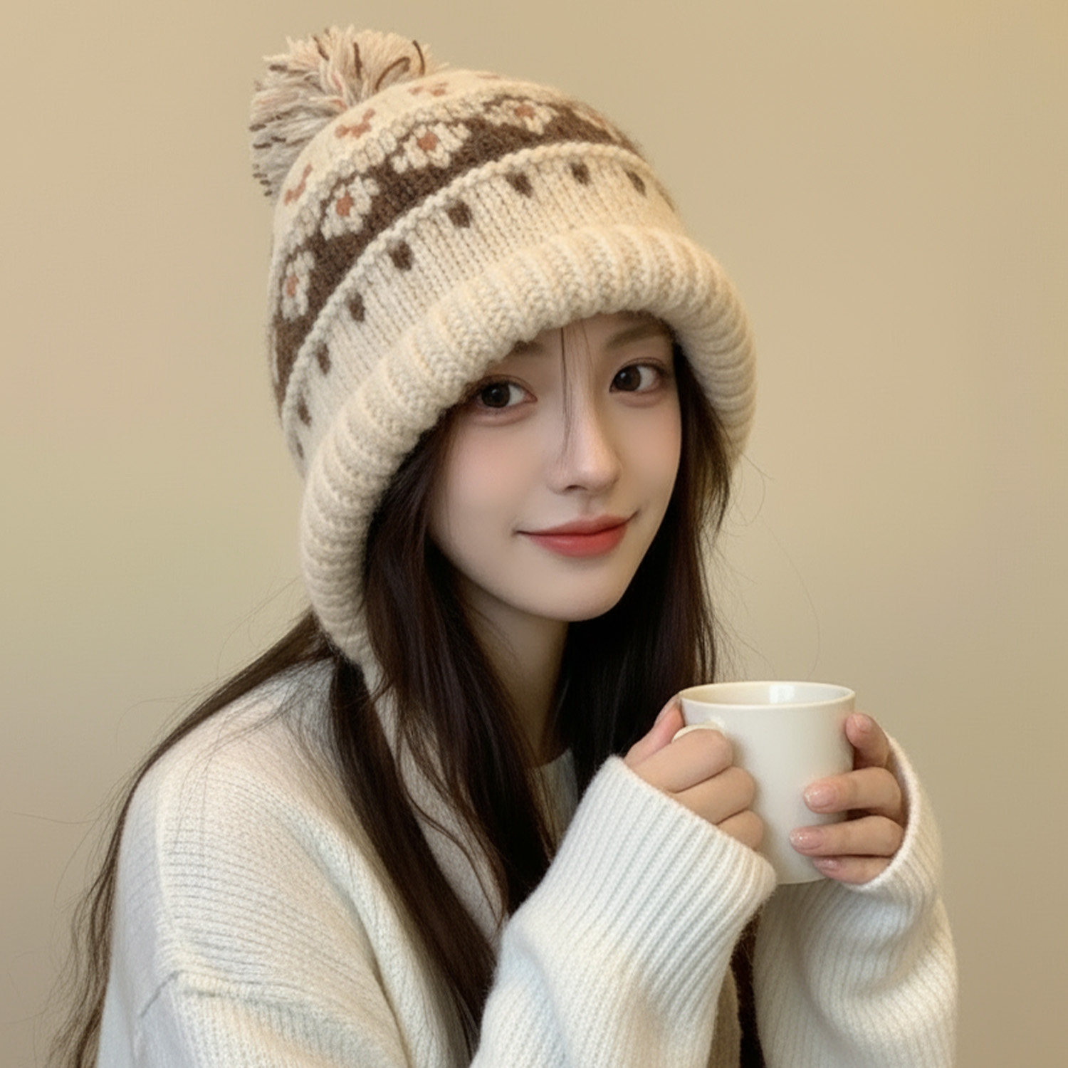 米白色费尔岛毛线帽子女2026新款冬加厚防寒护耳帽针织保暖雷锋帽