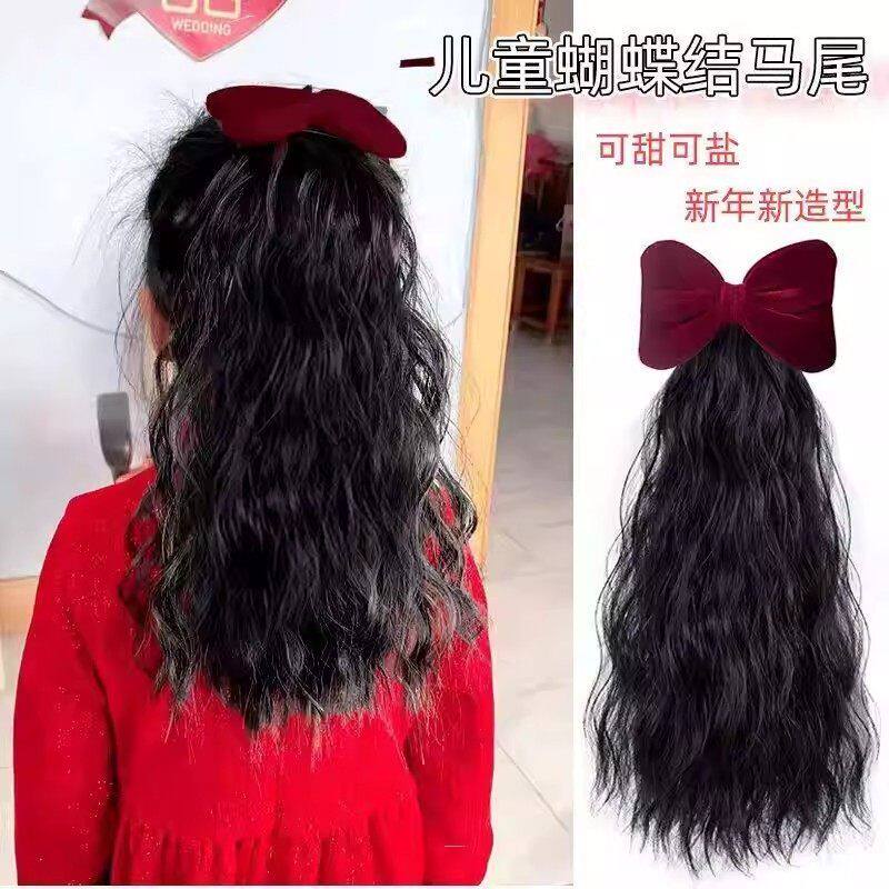 新春儿童假发丝绒蝴蝶结羊毛卷洋气可爱卷发30厘米长发马尾绑带