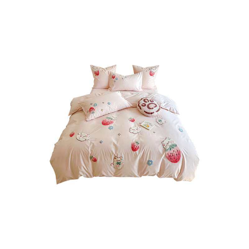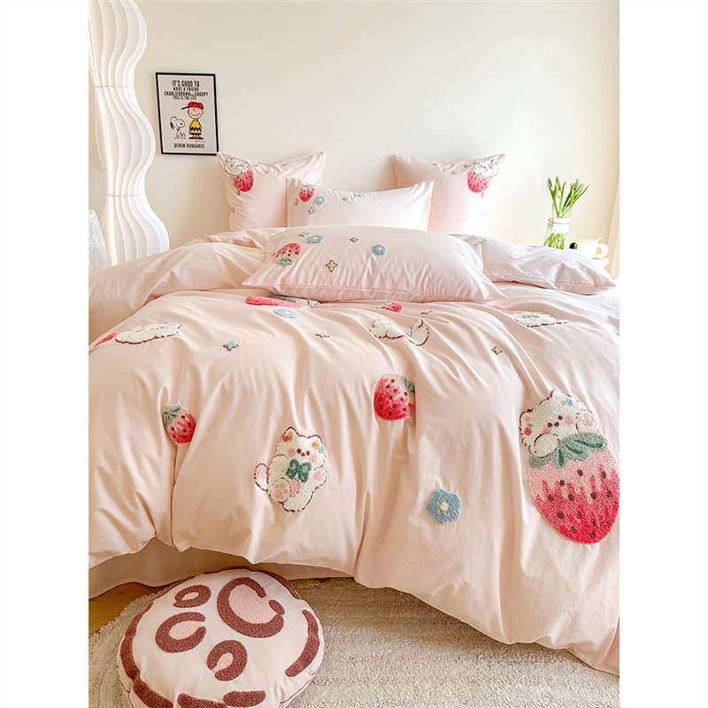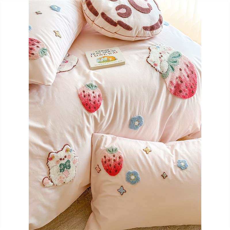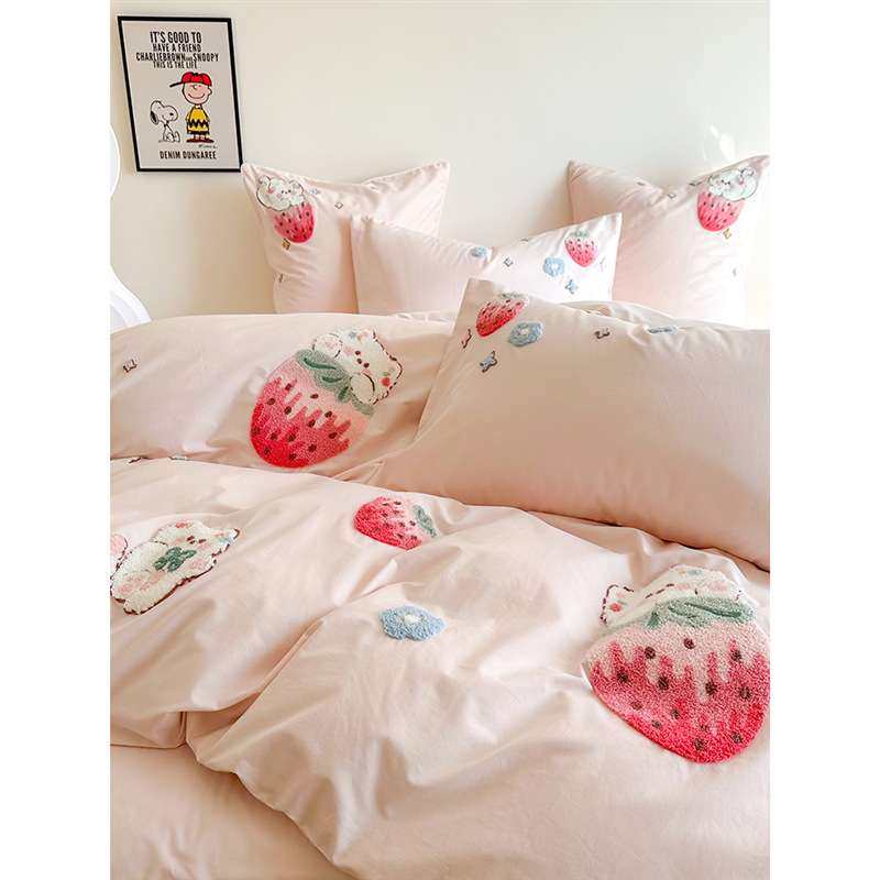 可爱猫咪60支全棉水洗棉四件套少女心草莓毛巾绣被套纯棉床上用品