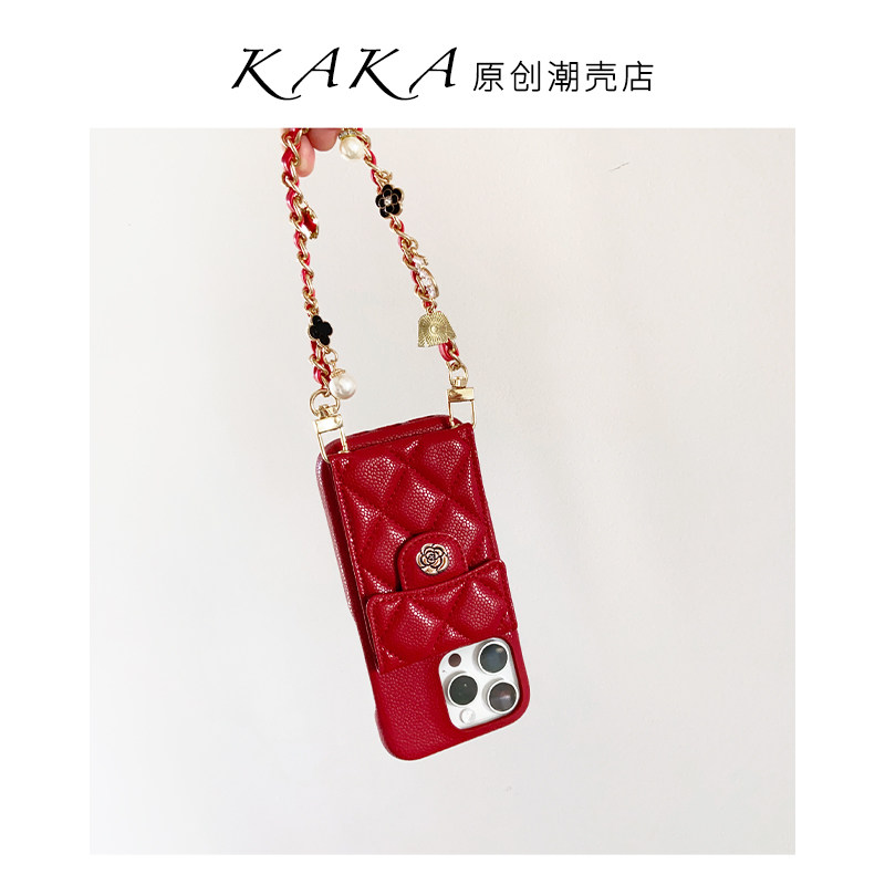 轻奢小香风红色零钱插卡适用于苹果15promax手机壳鱼子酱手提皮链条iPhone16带化妆镜14荔枝纹13保护套12新款