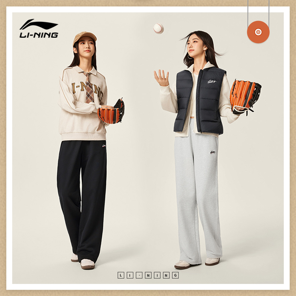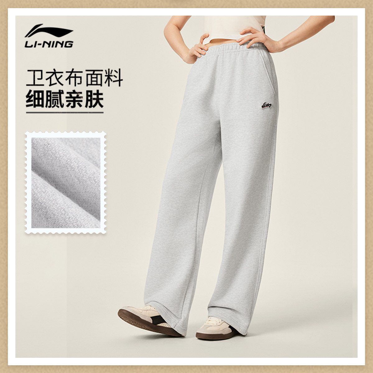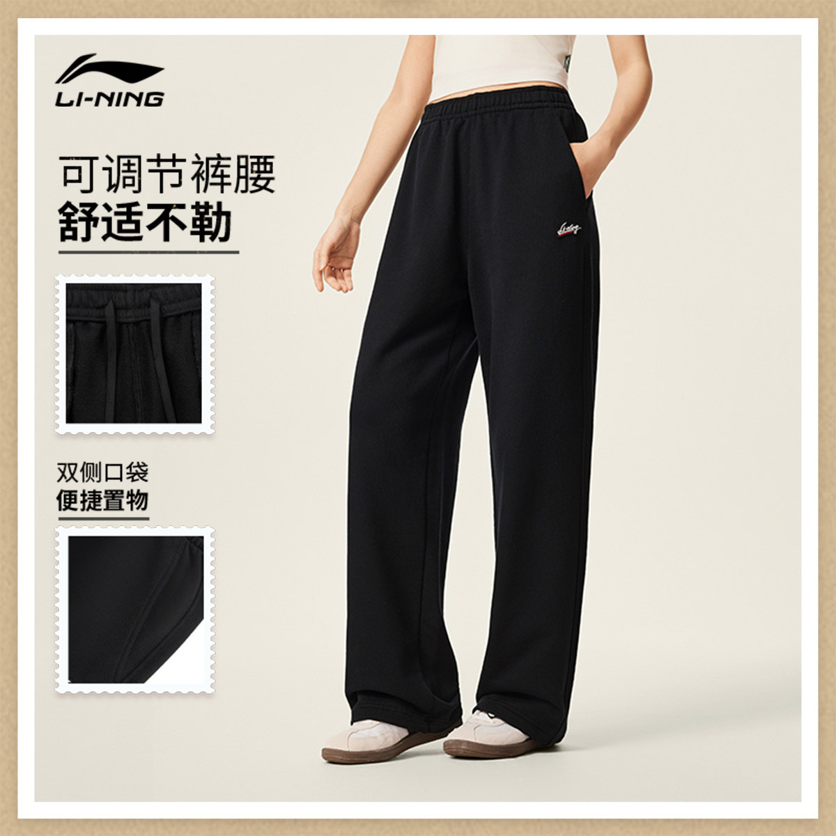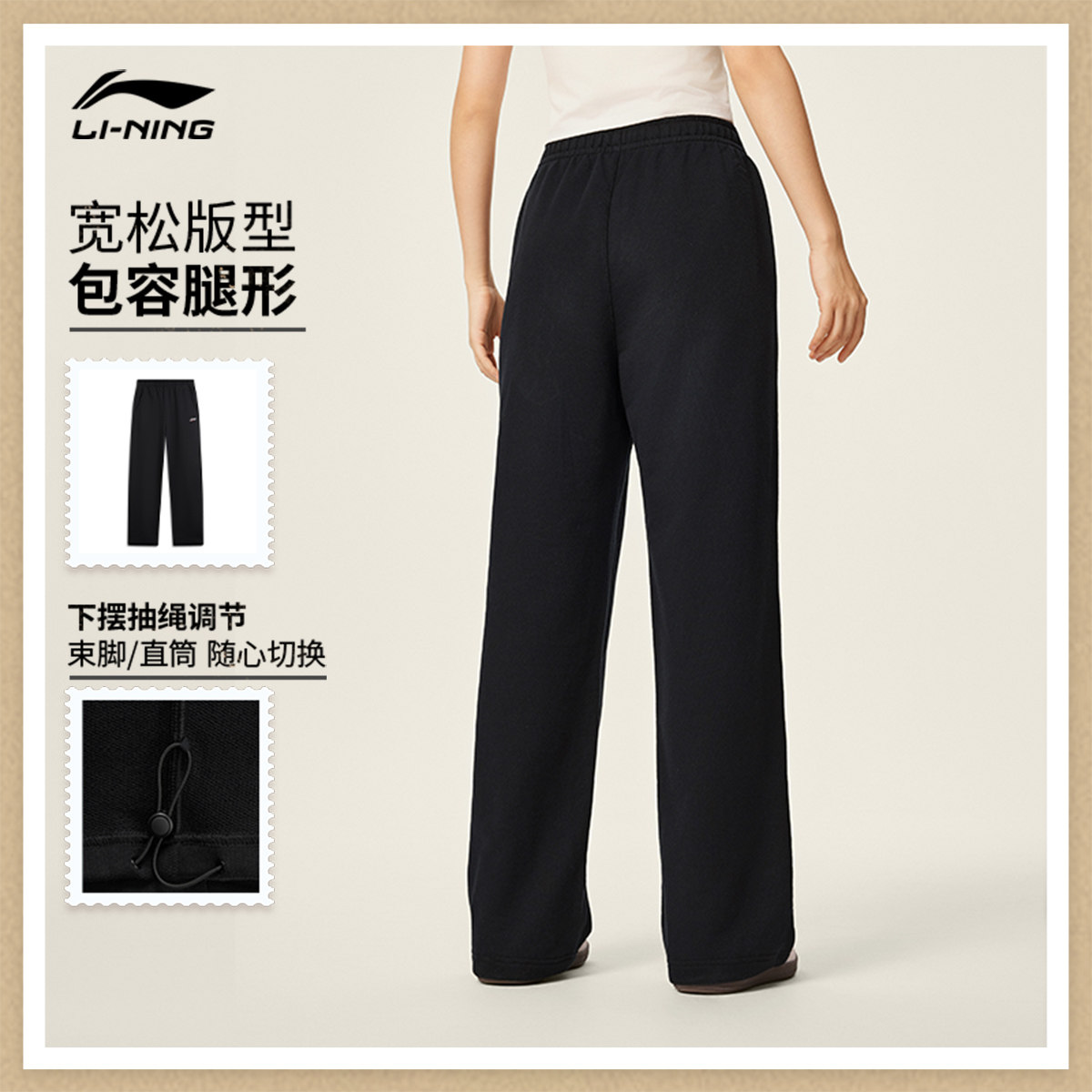 李宁卫裤女士25新款黑色裤子宽松冬季休闲毛圈直筒针织运动裤女