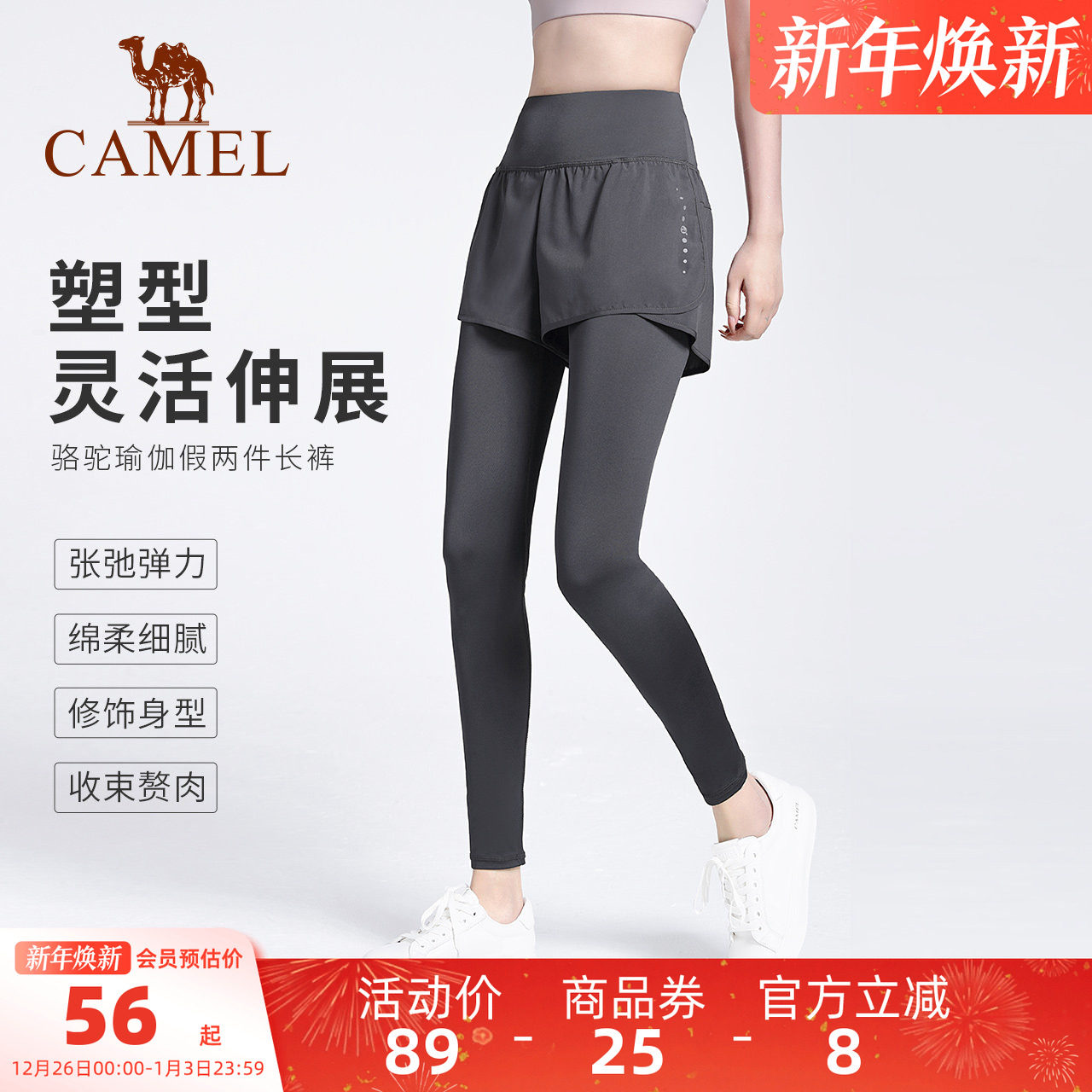 骆驼瑜伽裤女假两件运动裤弹力健身裤外穿紧身裤跑步裤防走光短裤