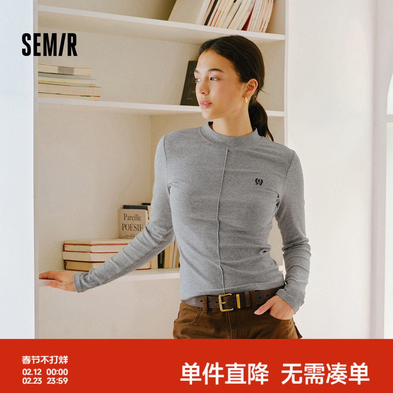 森马长袖T恤女冬半高领小心机分割2025新款刺绣紧身磨毛上衣显瘦