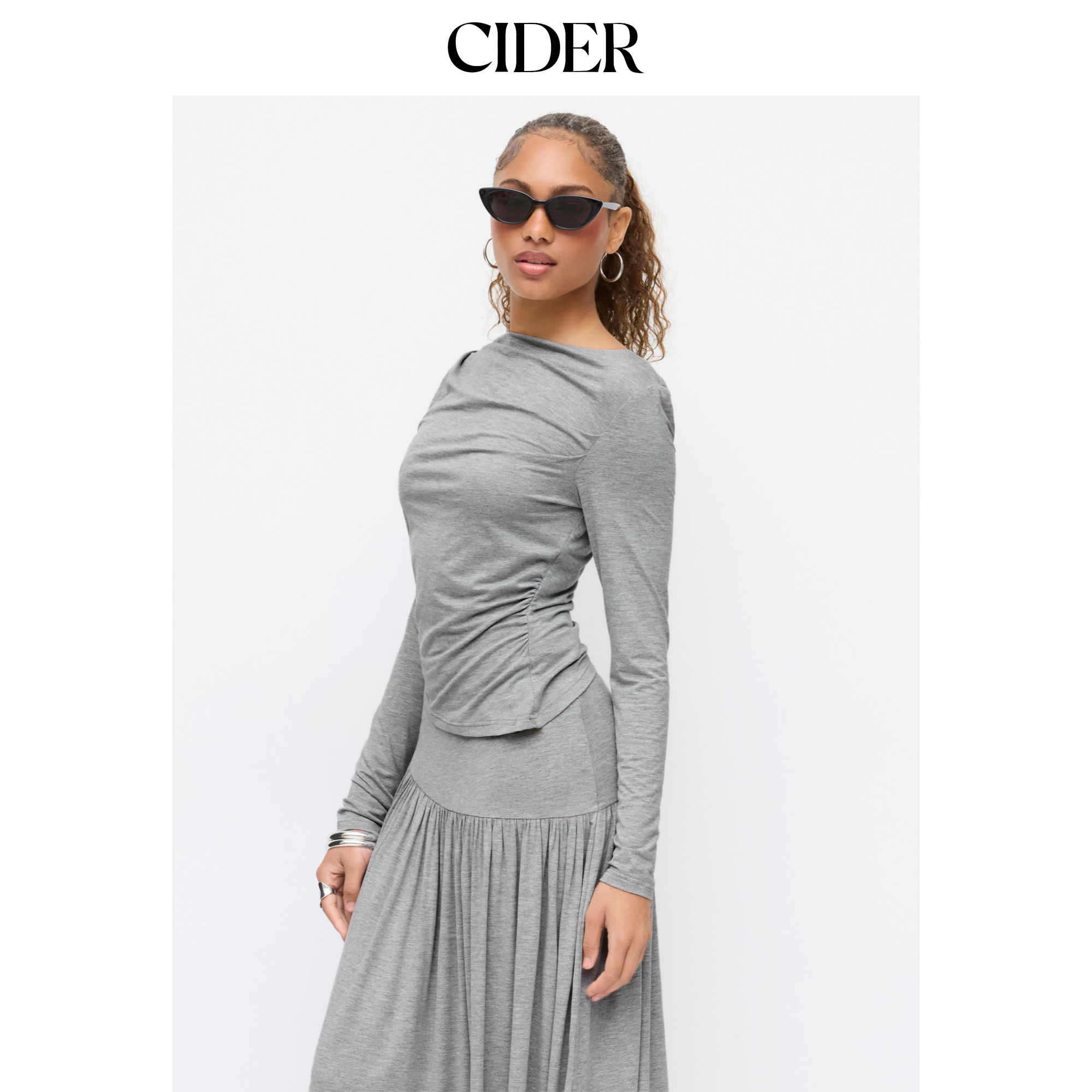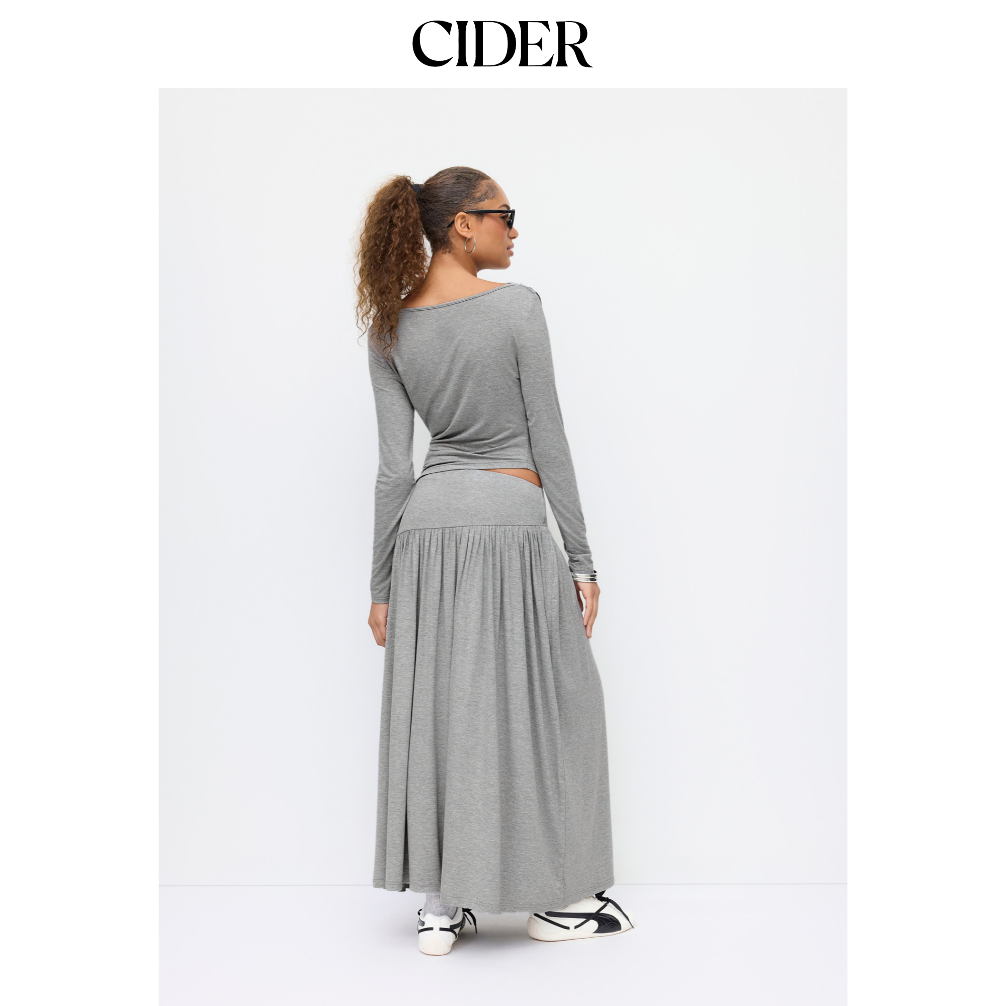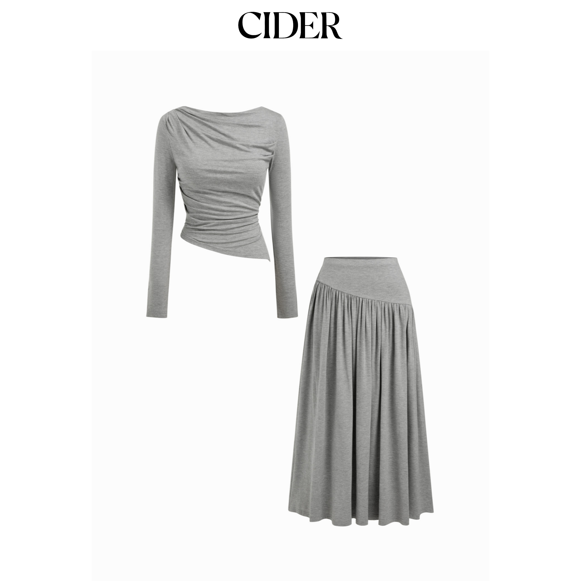 CIDER船领褶皱不对称下摆上衣搭高腰长裙套装115006555