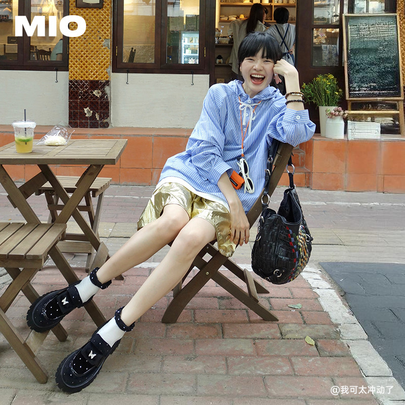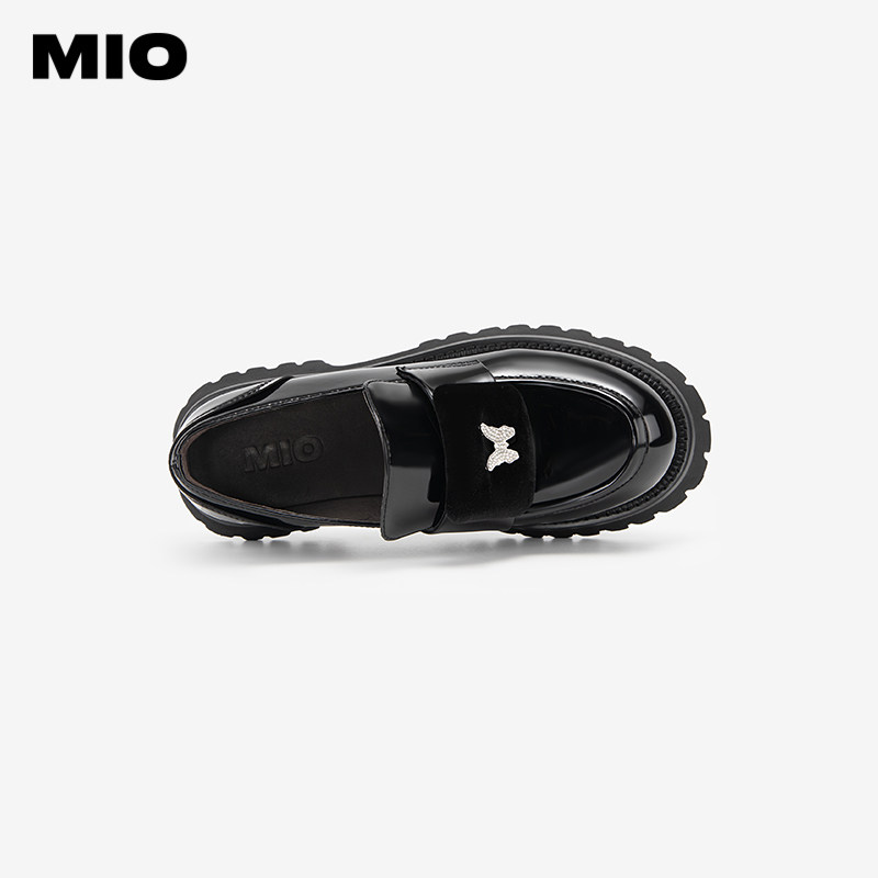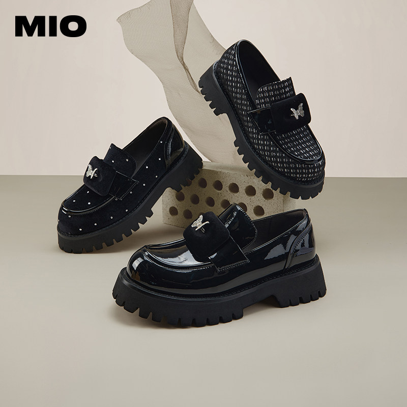 MIO米奥通勤粗跟单鞋复古学院蝴蝶钻饰小众厚底增高乐福鞋