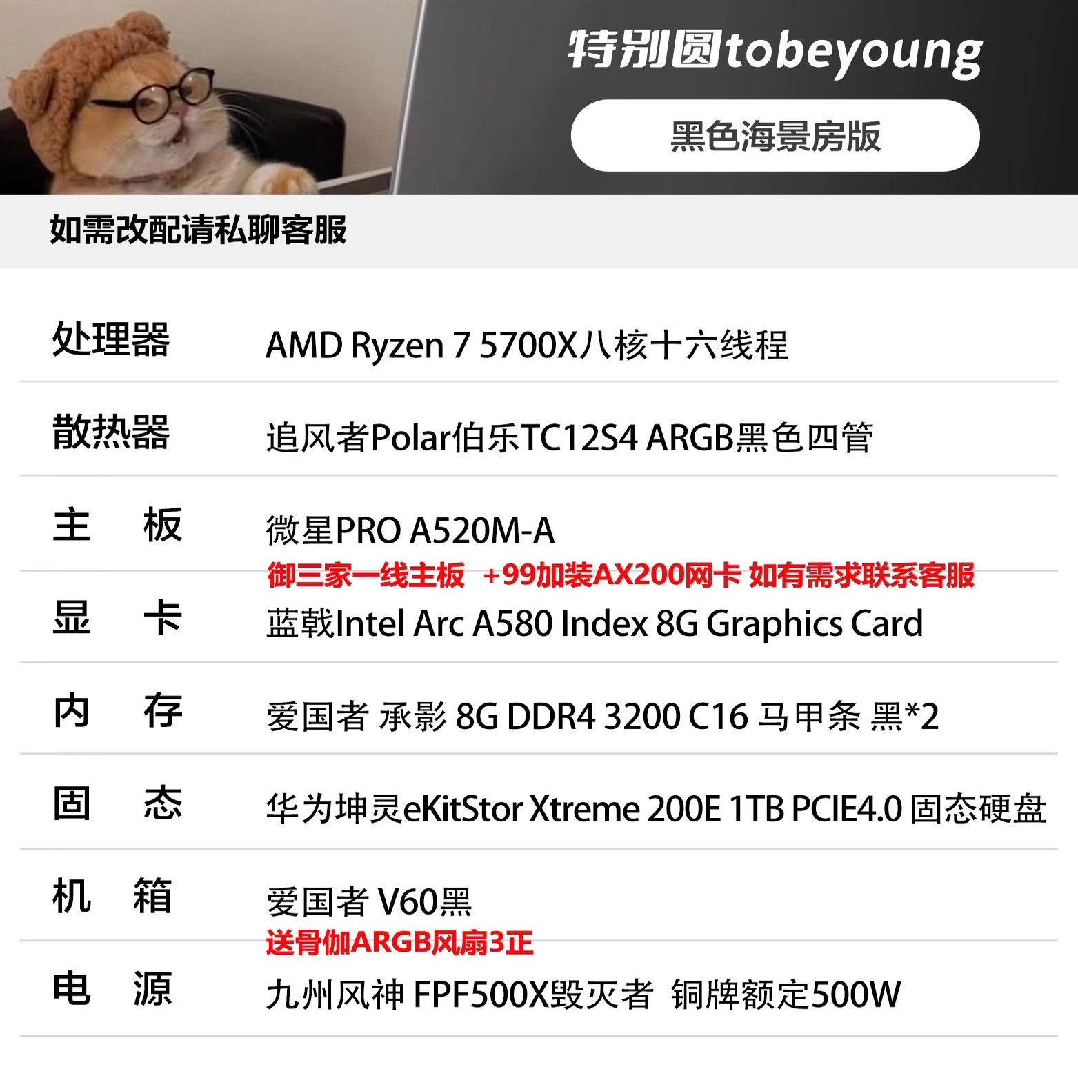 超强4000元神机R7 5700X+ A580黑色海景房游戏DIY电脑主机