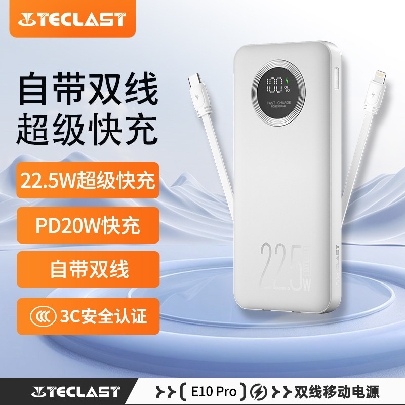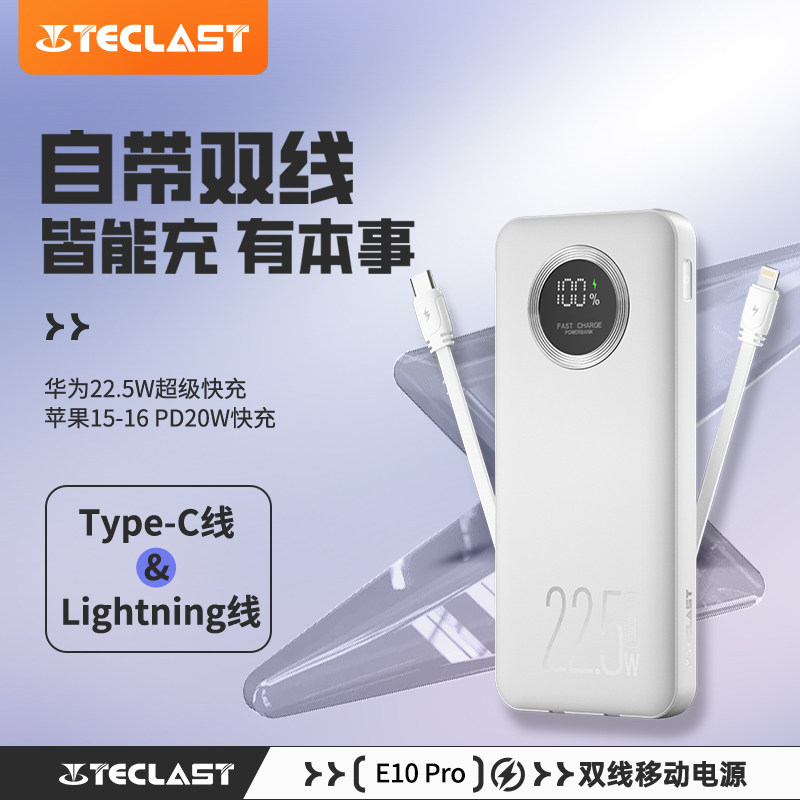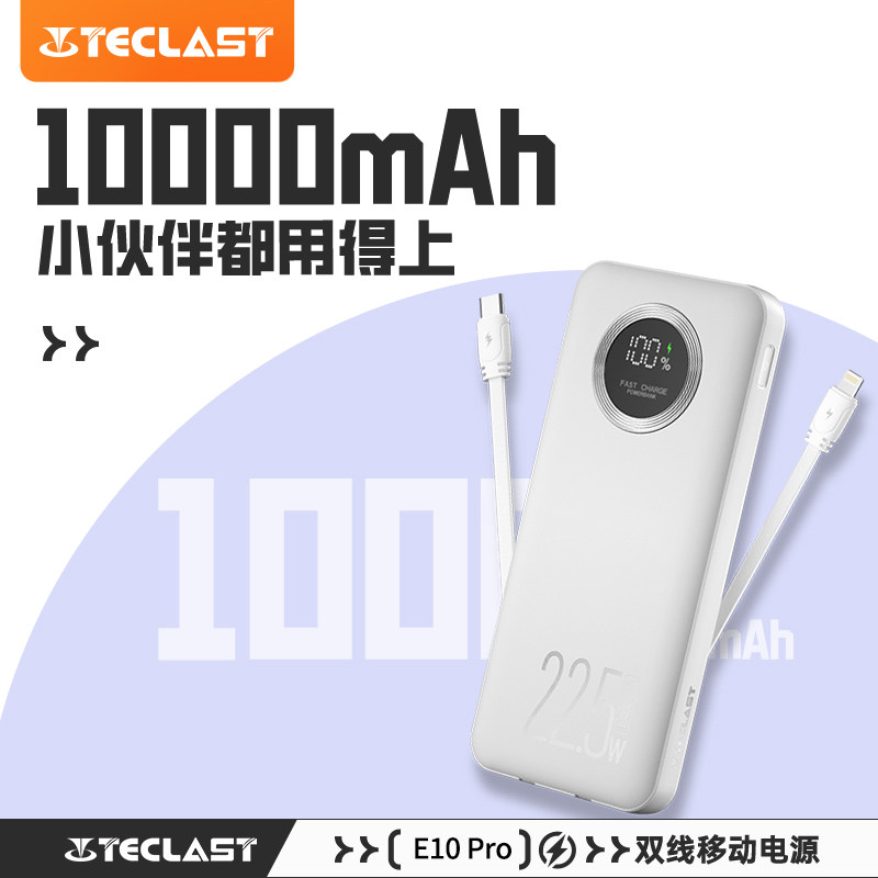 台电TECLAST【3C认证】自带线充电宝22.5W快充10000毫安时可上飞机大容量迷你移动电源 适用苹果16华为小米白