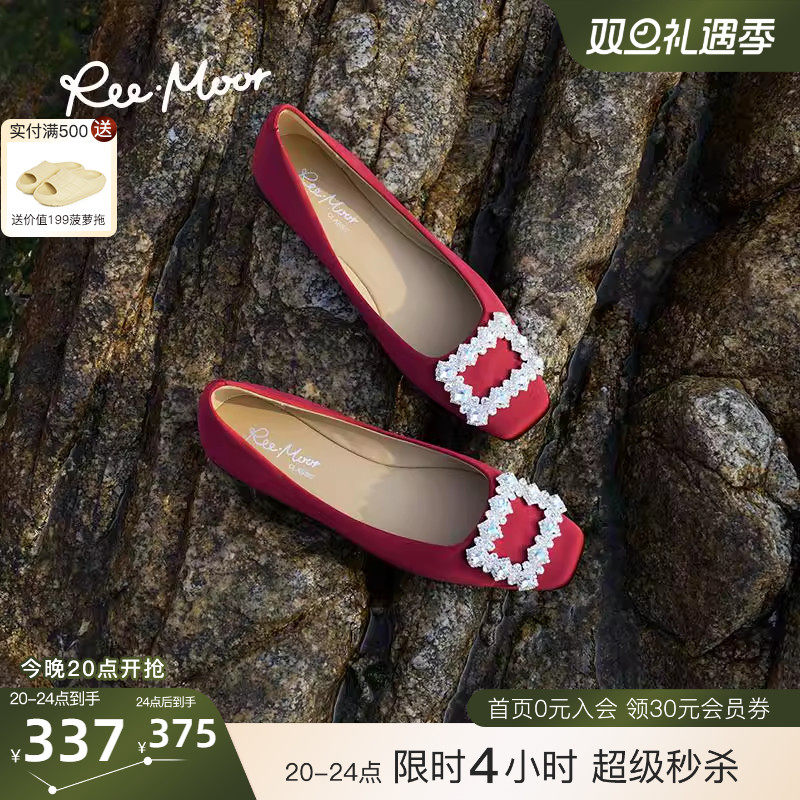 REEMOOR睿慕2025秋季新款法式方头浅口单鞋水钻方扣平底鞋女