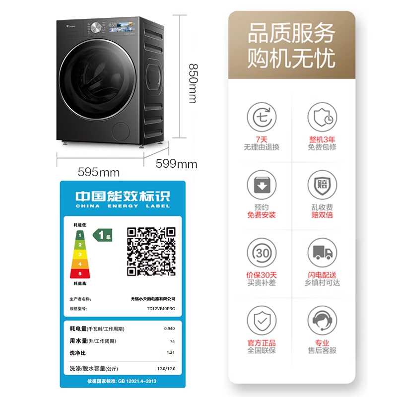 [纯平全嵌] 小天鹅小乌梅3.0家用12KG大容量全自动洗烘一体E40PRO