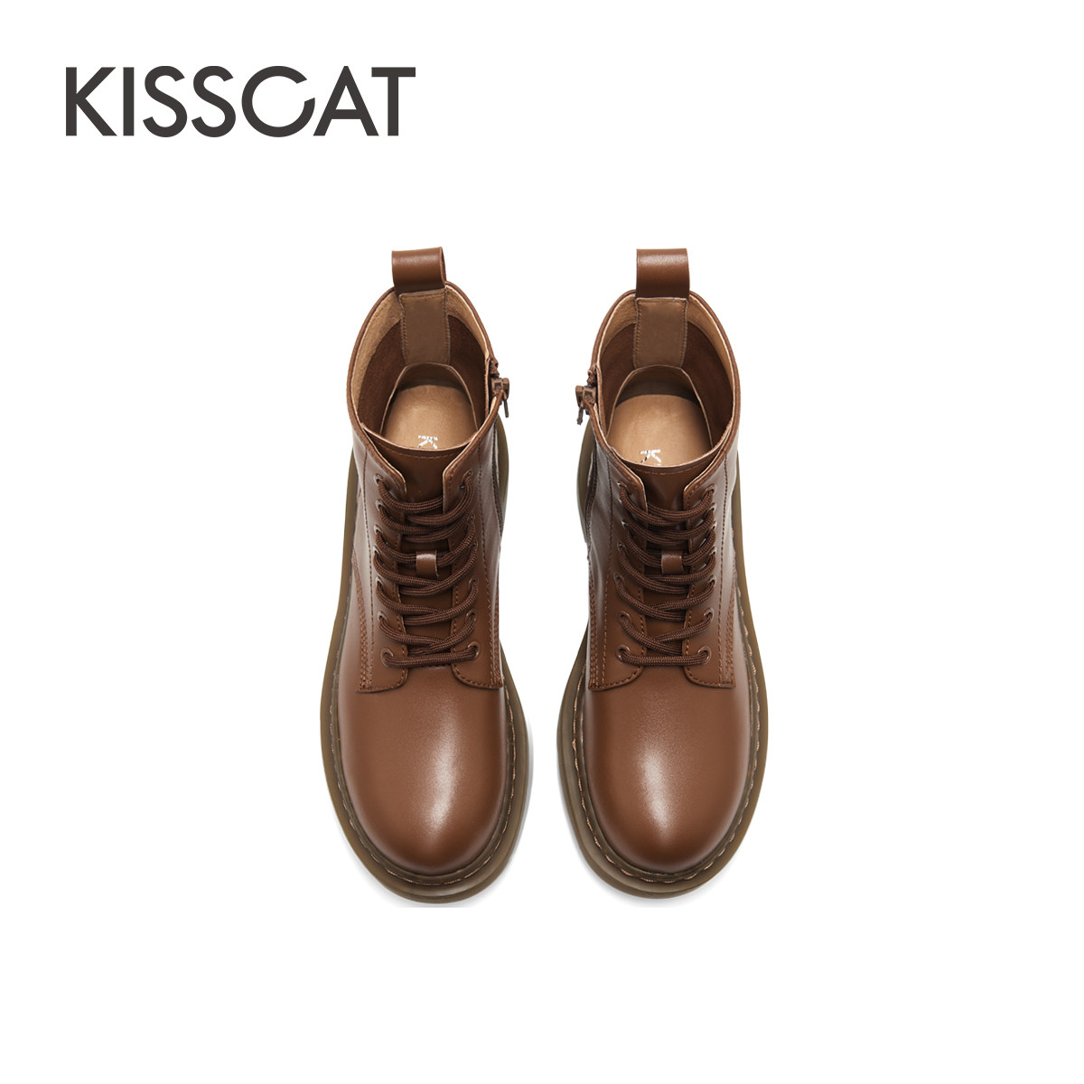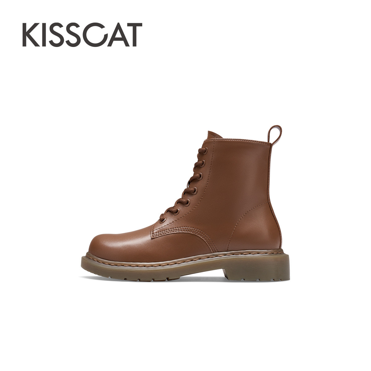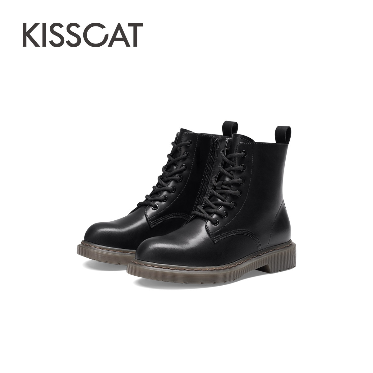 [舒心]接吻猫秋季新款经典百搭短靴轻便气质真皮加绒系带马丁靴女