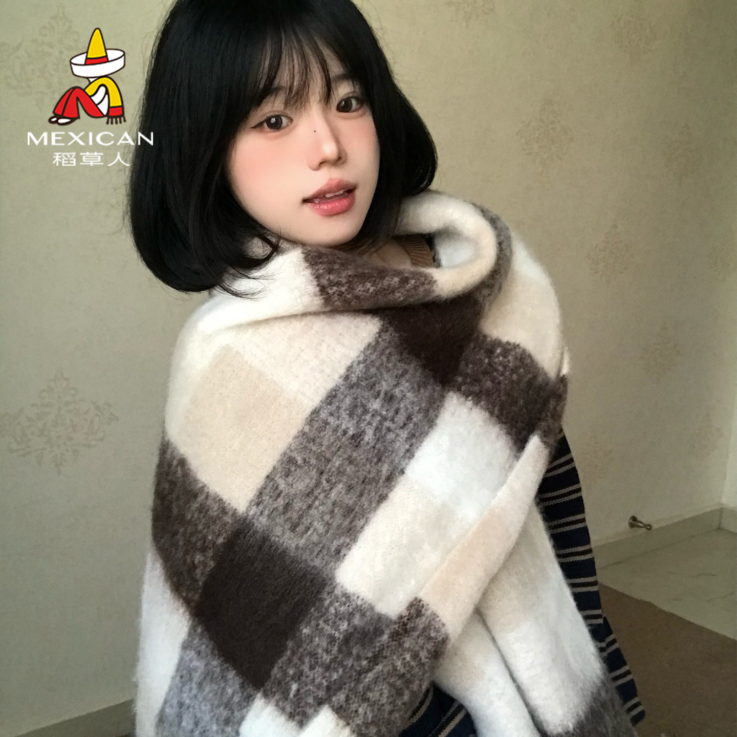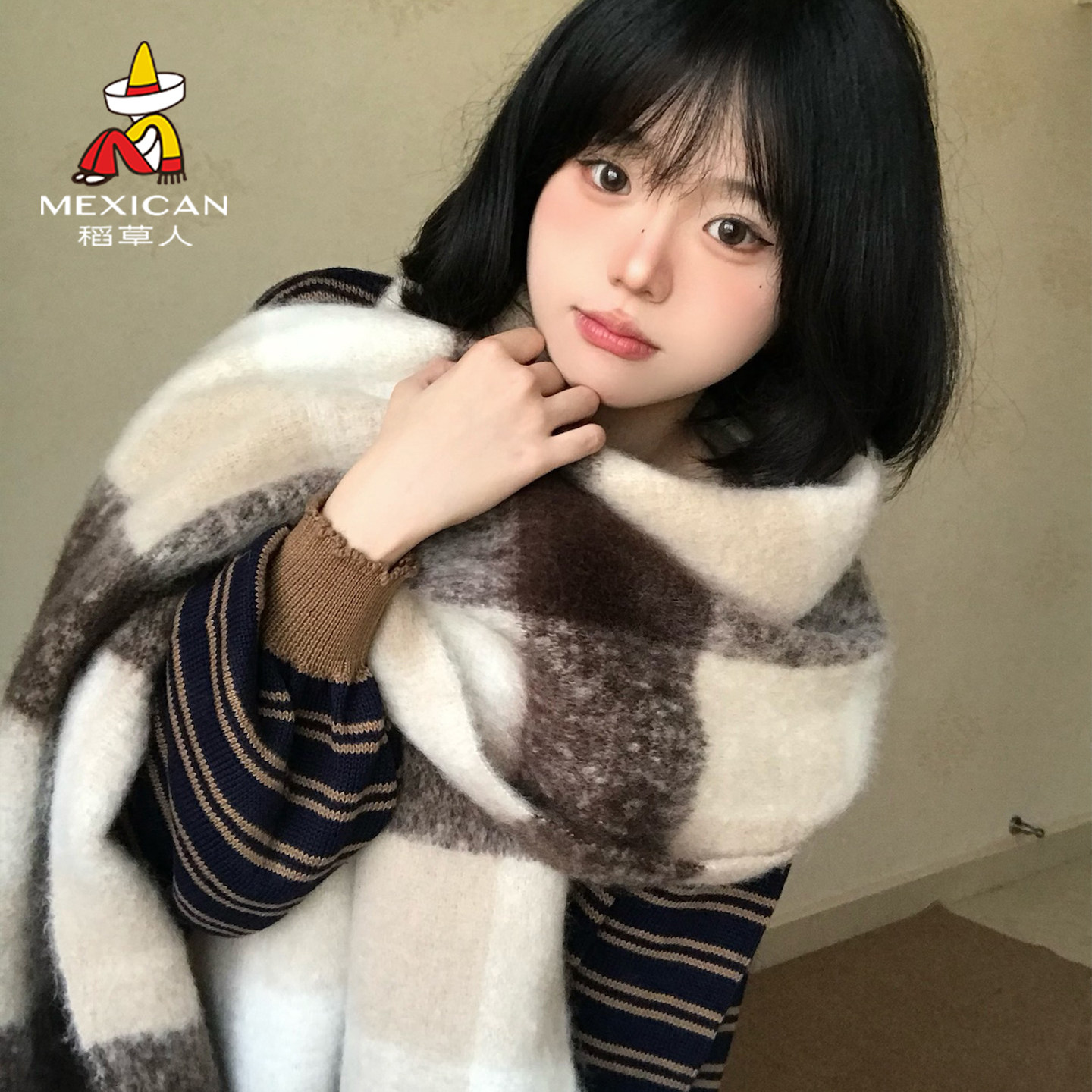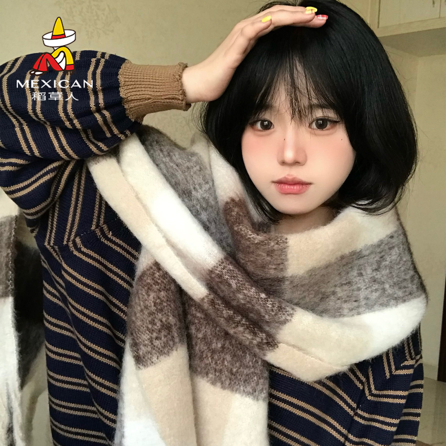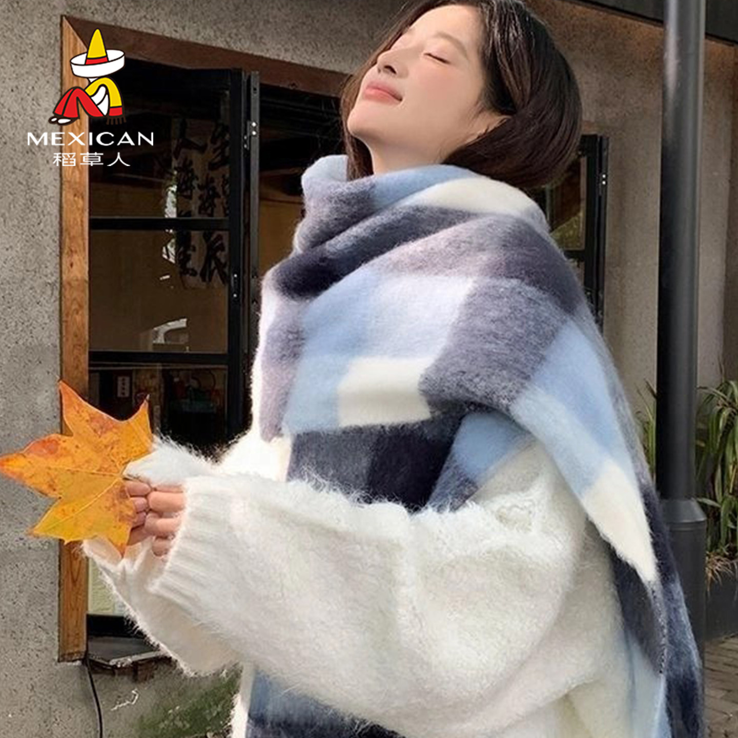 稻草人韩系蓝白格子围巾女秋冬季百搭保暖围脖加厚情侣披肩氛围感