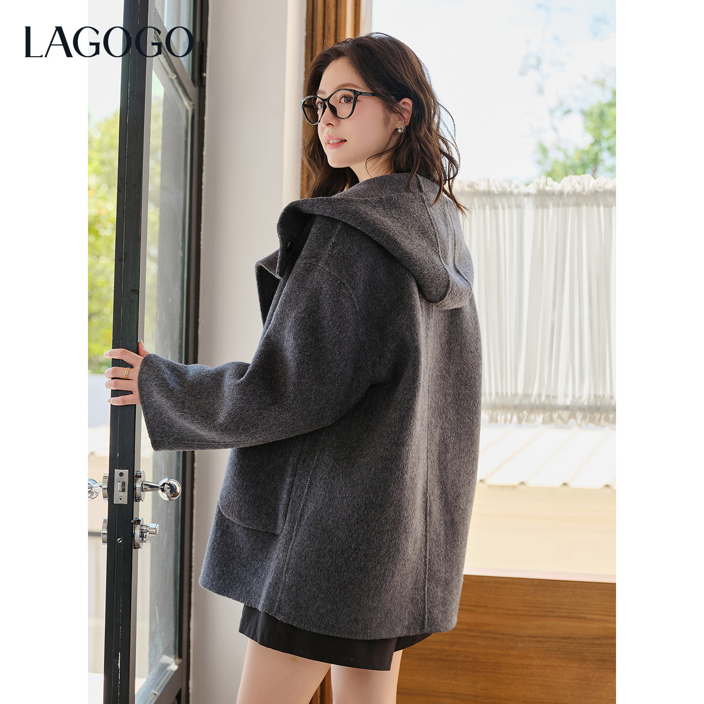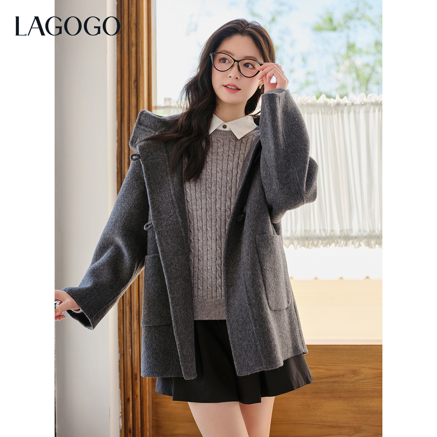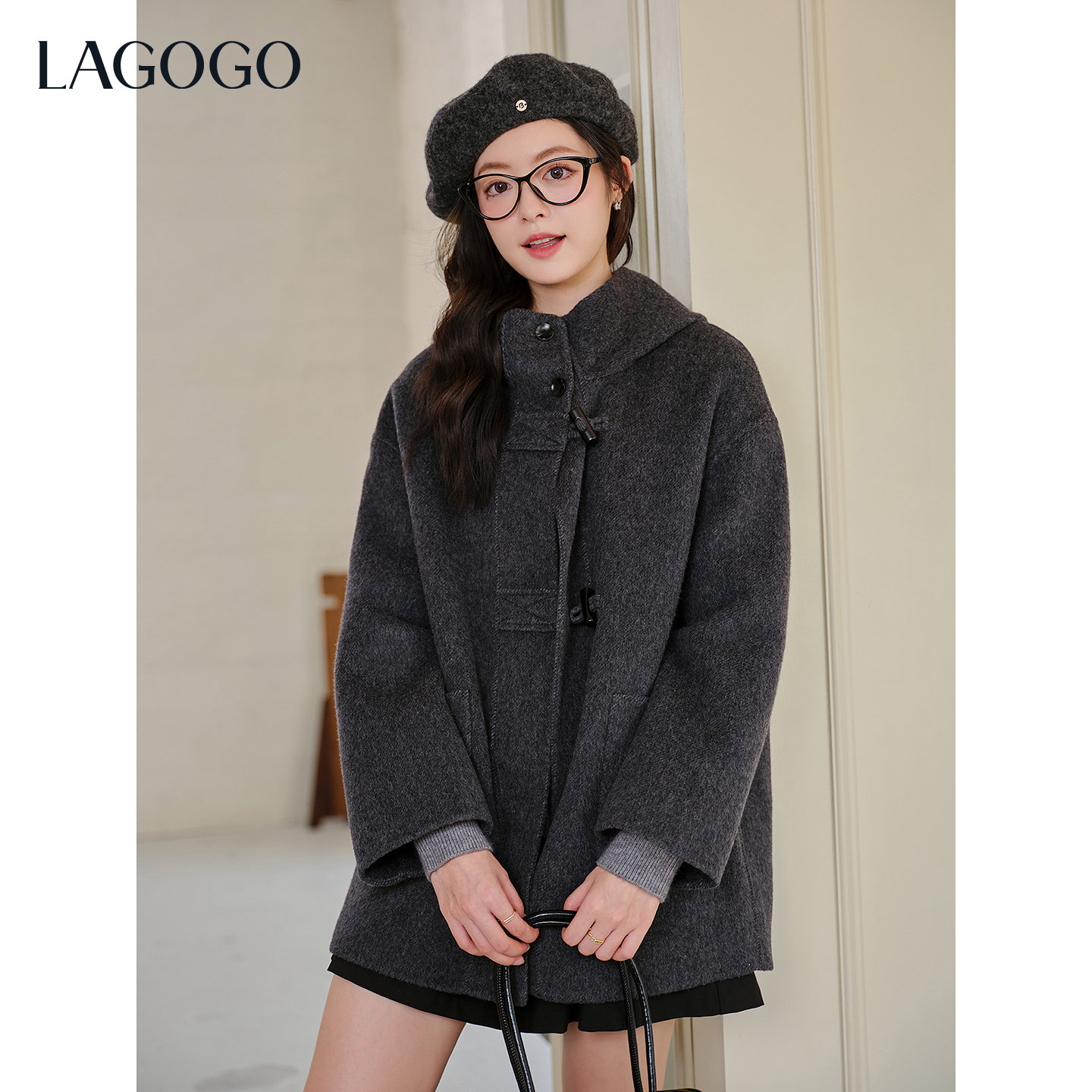 羊毛LAGOGO灰霭漫游仿牛角扣双面呢大衣女拉谷谷2025冬新款外套