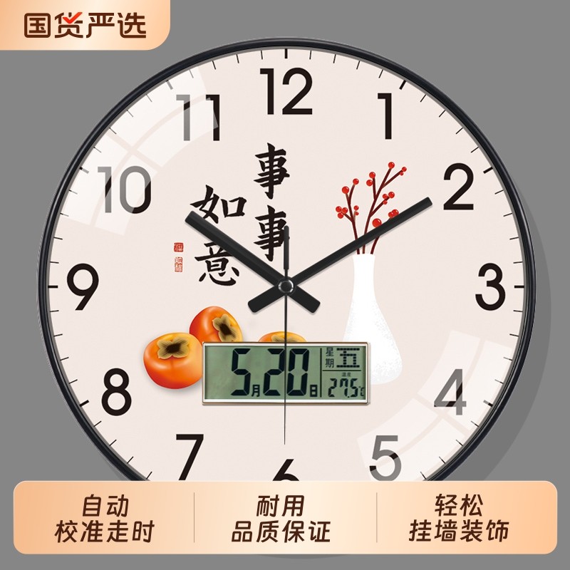 事事如意日历星期温度自动对时电波静音挂钟客厅卧室石英钟表挂墙