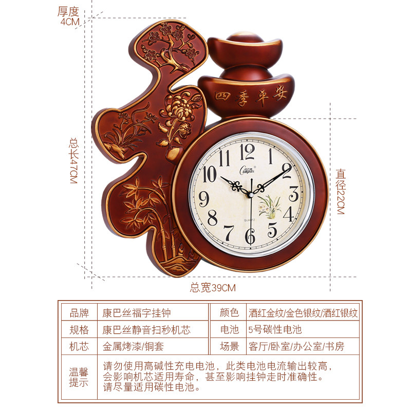 康巴丝客厅挂钟卧室办公静音壁钟表创意中国风福字家用挂墙石英钟