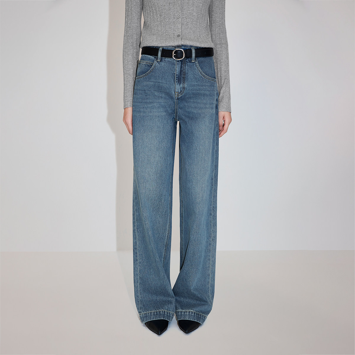 twosweet【超级裤神】四面弹重塑大长腿高腰直筒微喇叭原色牛仔裤