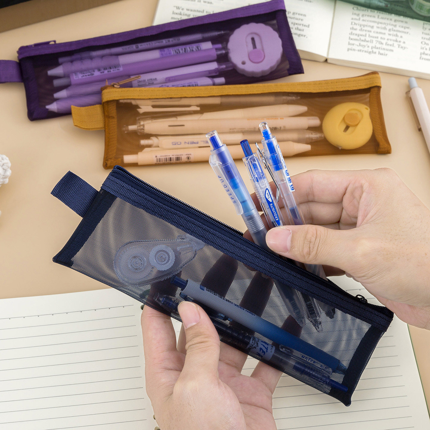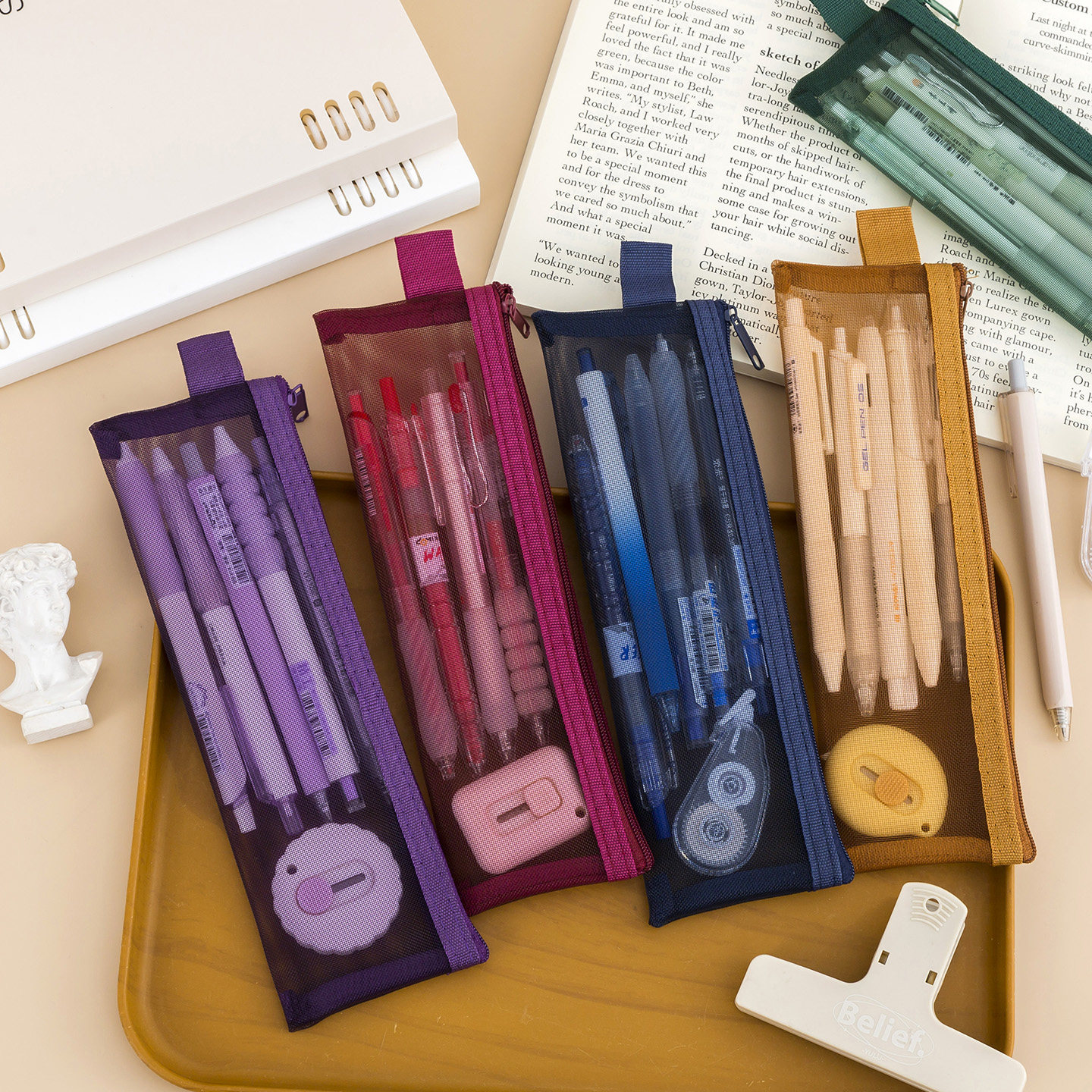 加长网纱透明笔袋可放20cm直尺画笔毛笔收纳袋书法工具保护袋考试专用便携mini方形文具袋美术学生画画铅笔袋