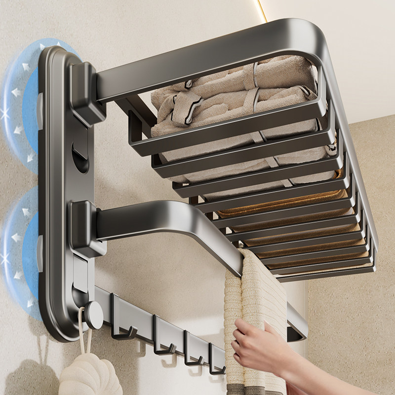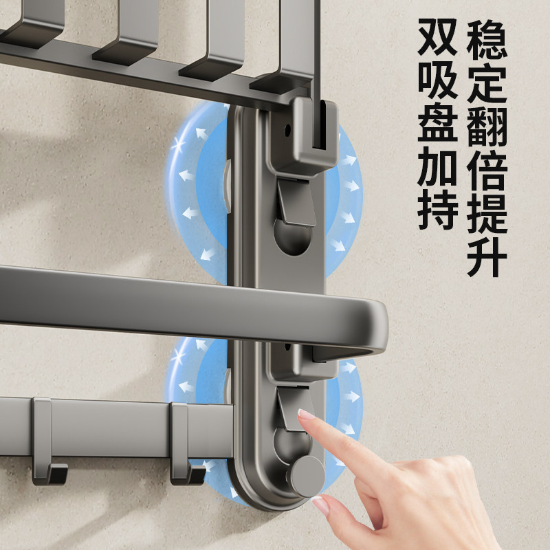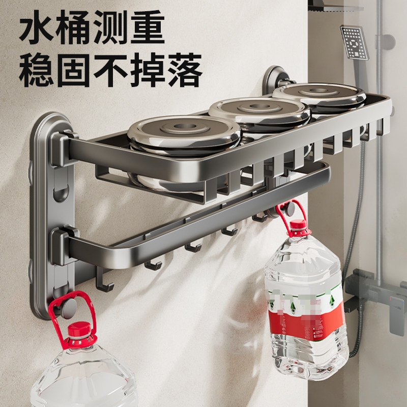 吸盘毛巾架卫生间免打孔网篮浴巾置物架一体浴室厕所折叠挂杆套件