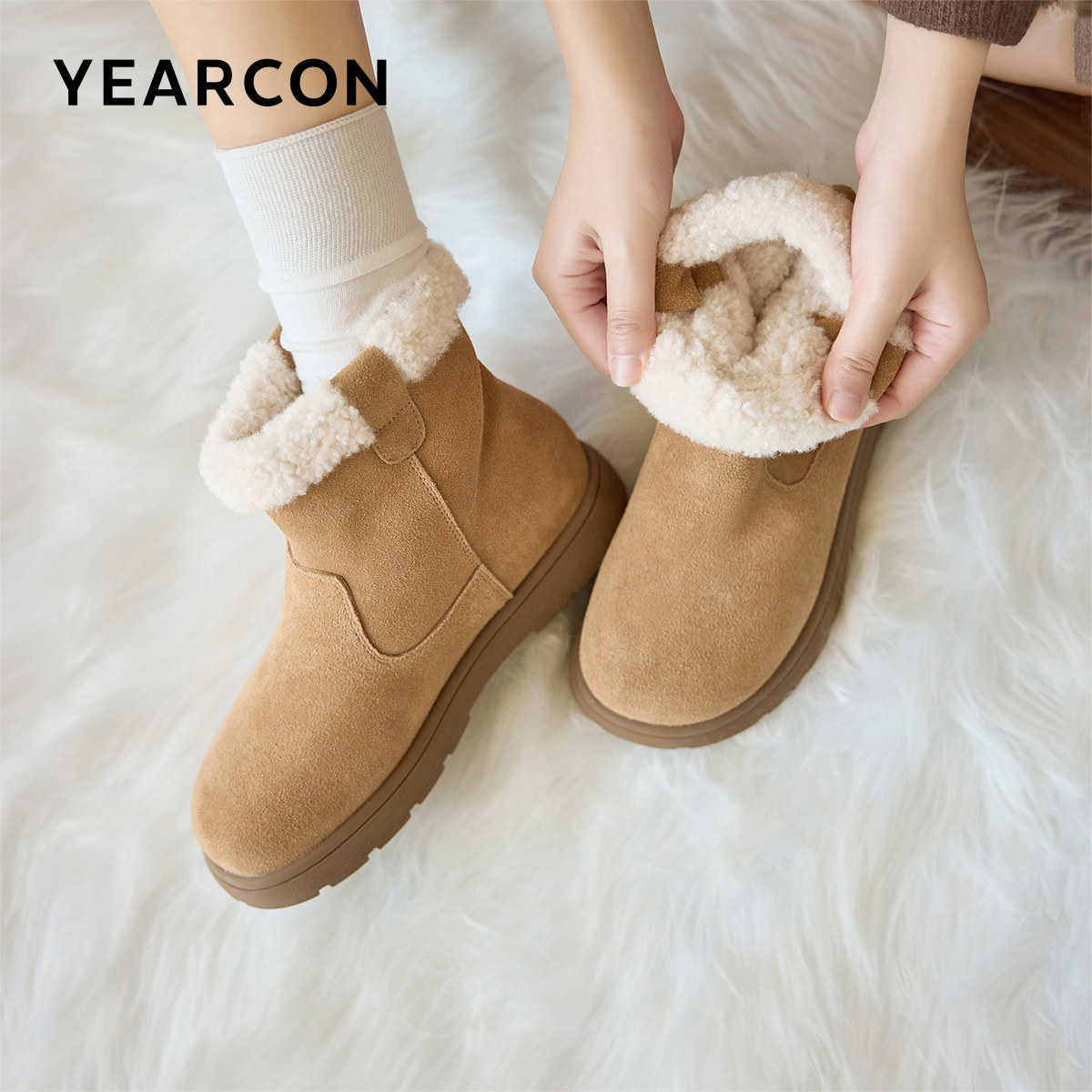 内增高~桑坡真皮厚底羊毛雪地靴女加绒保暖东北棉靴秋冬季短筒靴