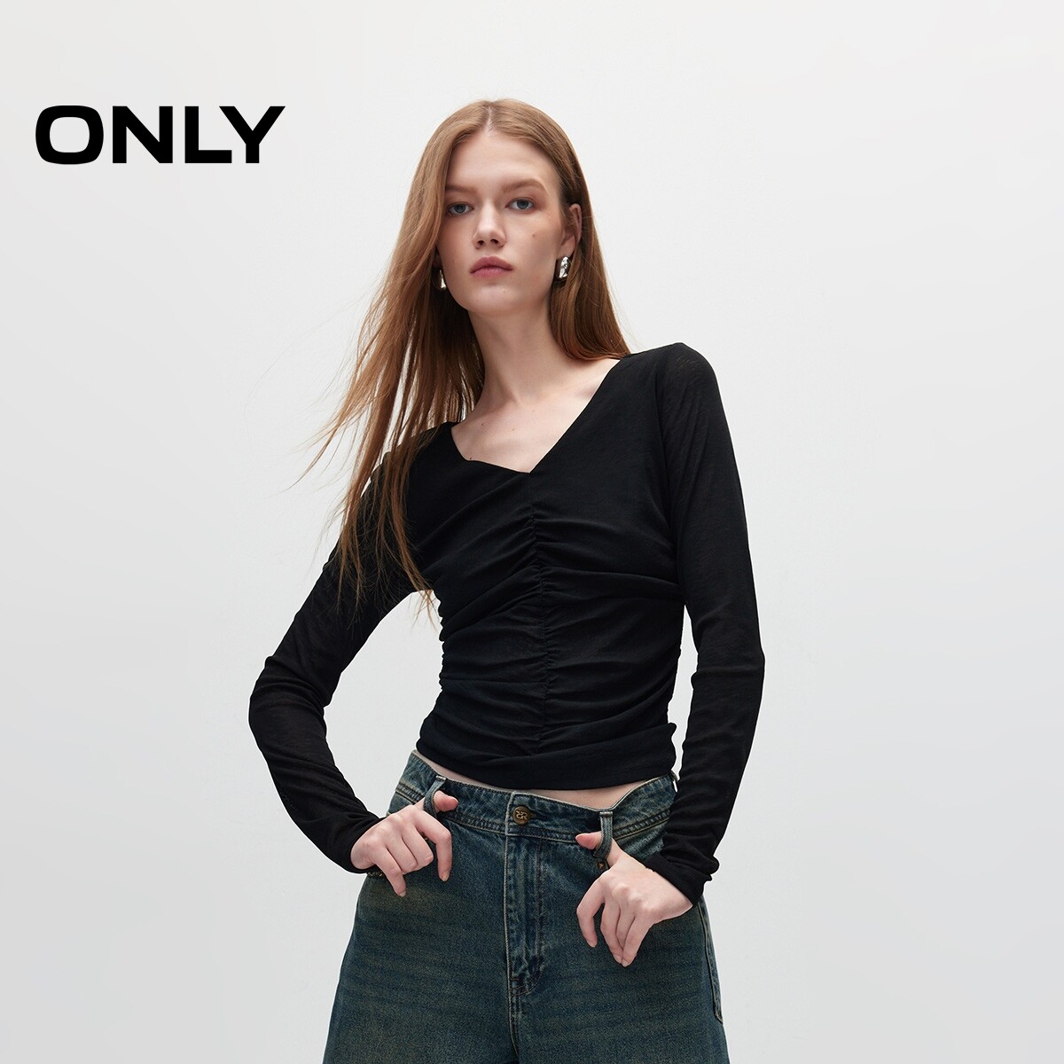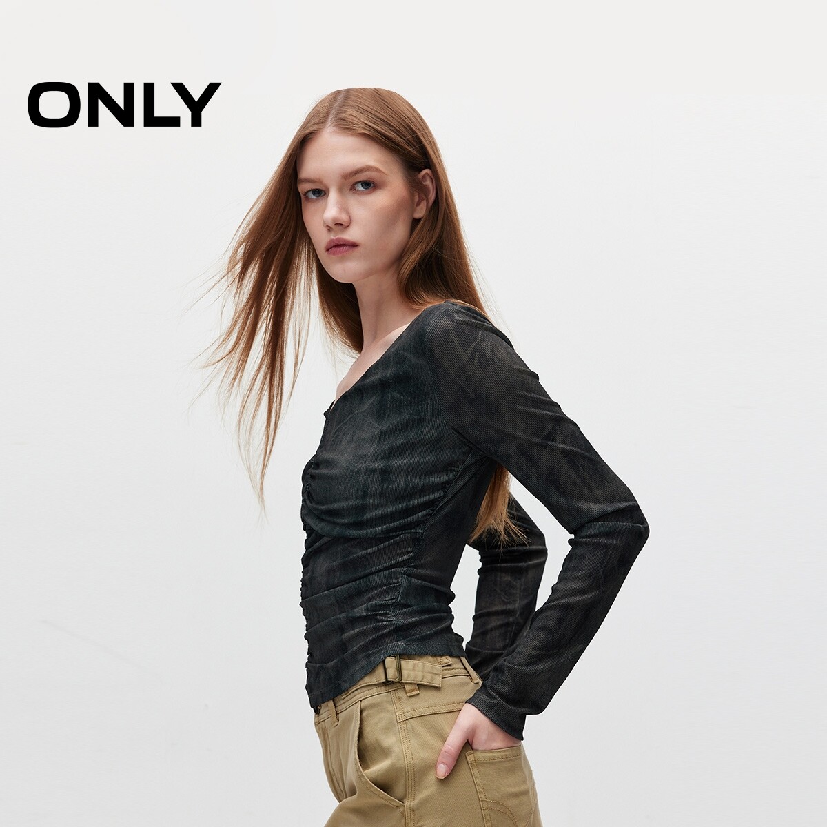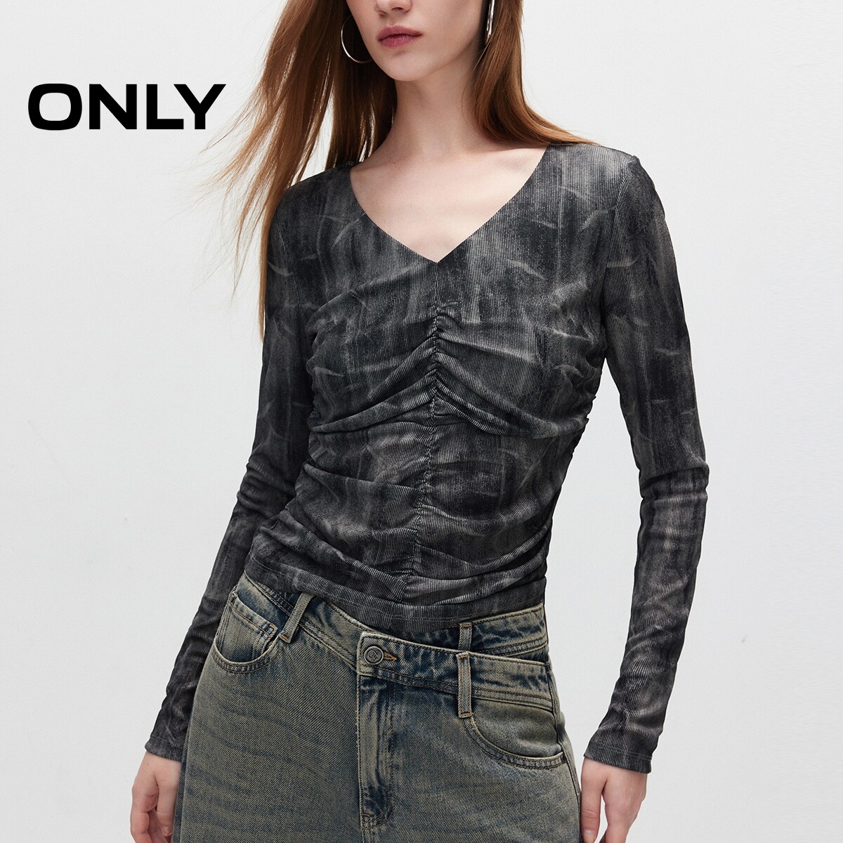 【ONLY奥莱】春季新款时尚做旧显瘦印花褶皱V领长袖T恤女