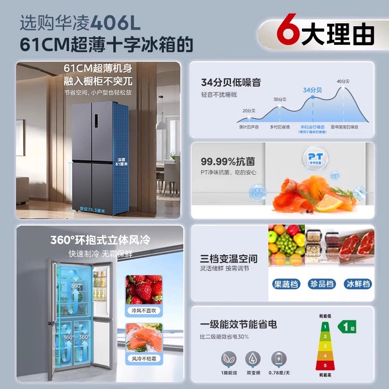 美的出品华凌426十字四门电冰箱家用风冷超薄嵌入净味大容量一级