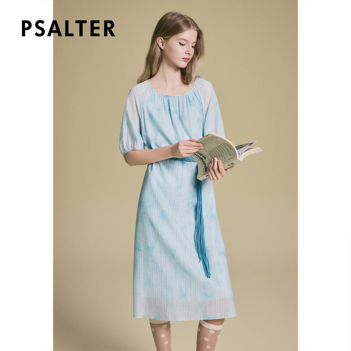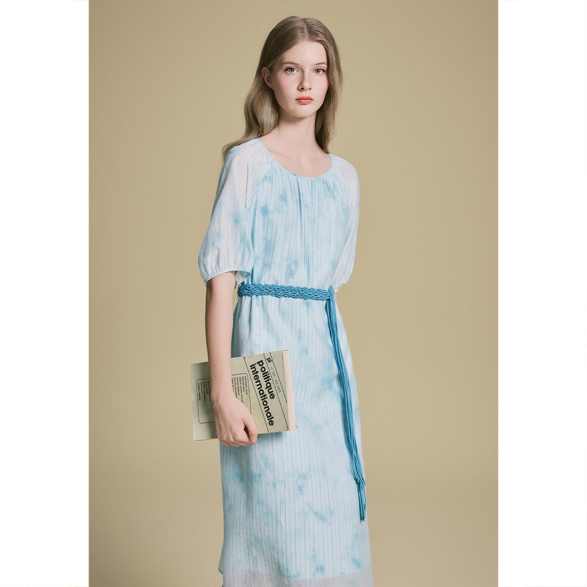 诗篇专选天丝亚麻艺术印花U型领编织腰带度假连衣裙2025夏季新款