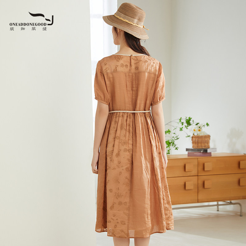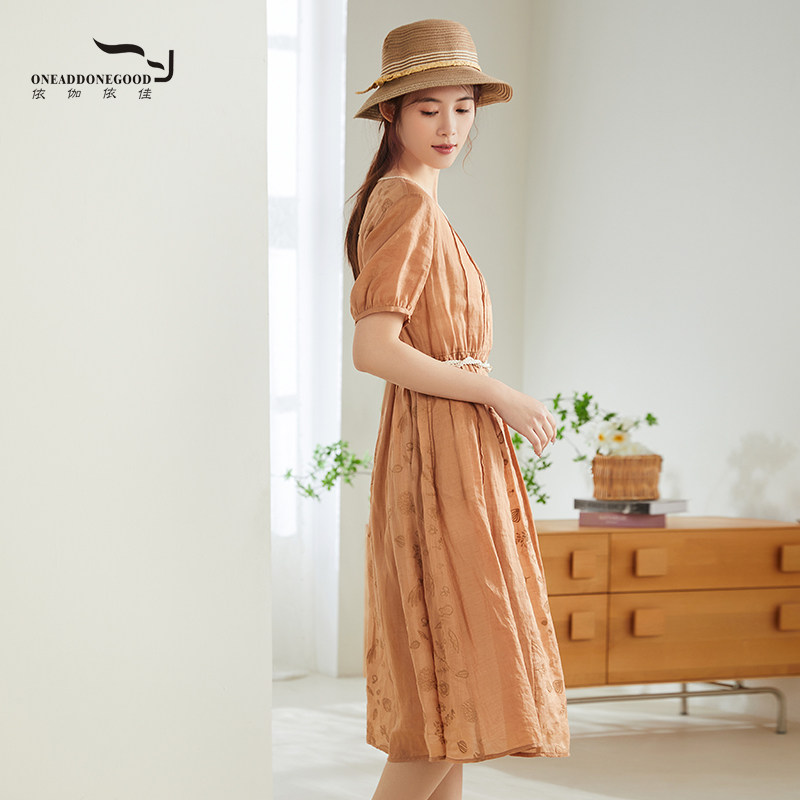 依伽依佳2023夏季新品连衣裙女纯色气质文艺短袖连衣裙ESXL015