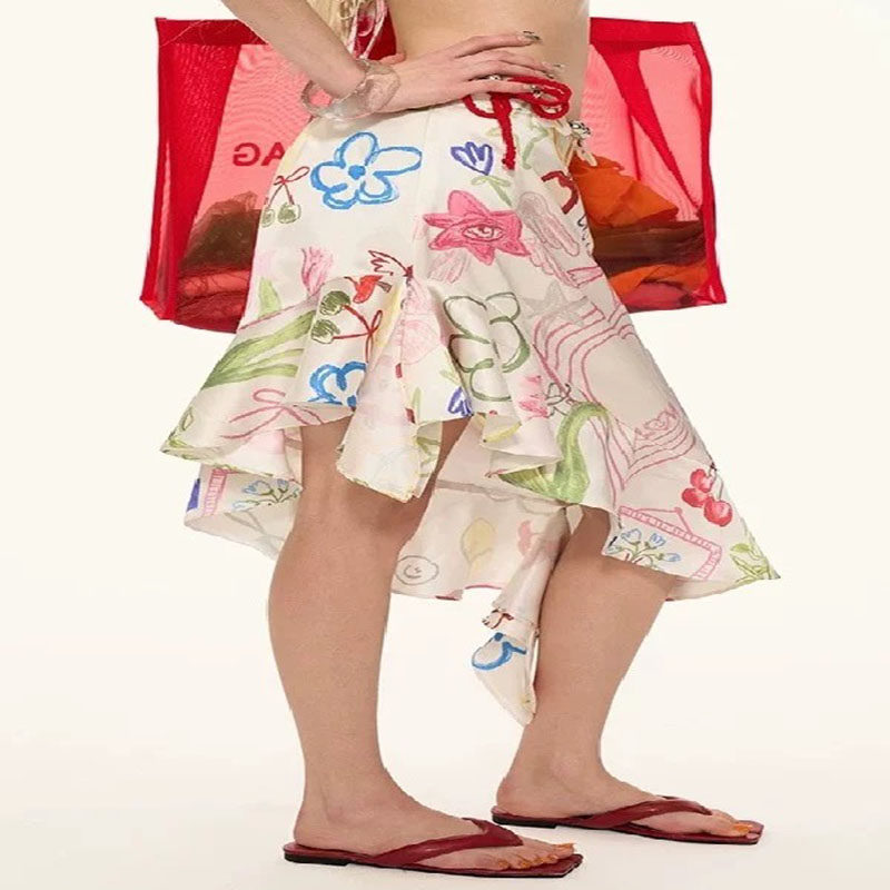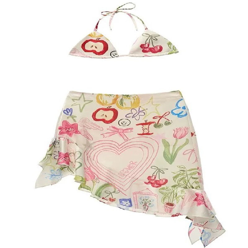 海边度假风不规则涂鸦印花三件套荷叶边海边度假泡温泉泳衣