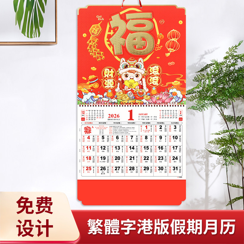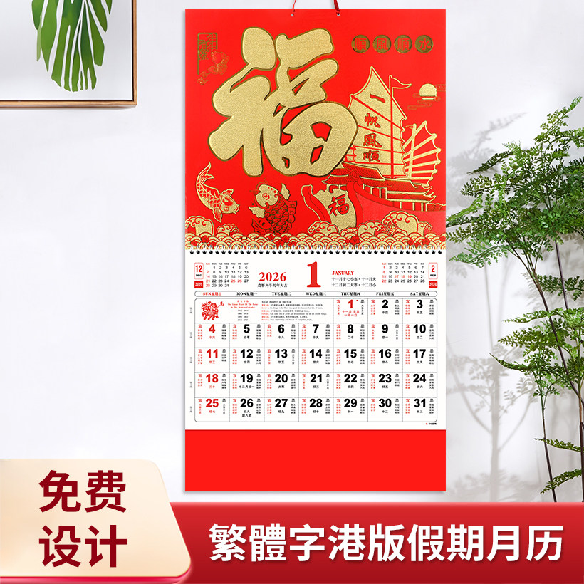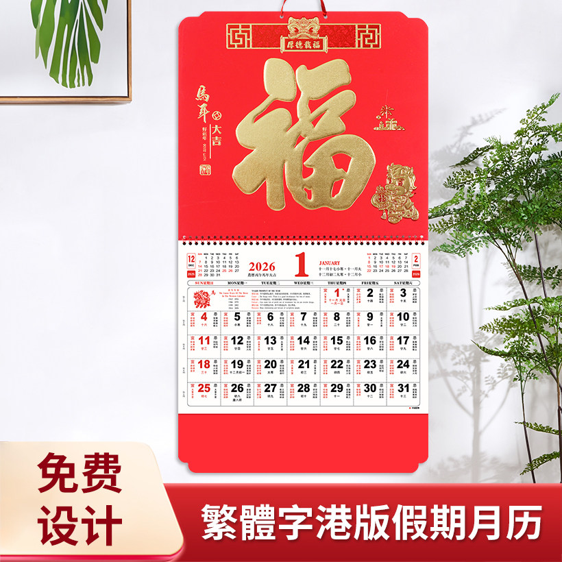 2026年正宗香港版假期福字金箔挂历日历月历定制企业专版印刷LOGO