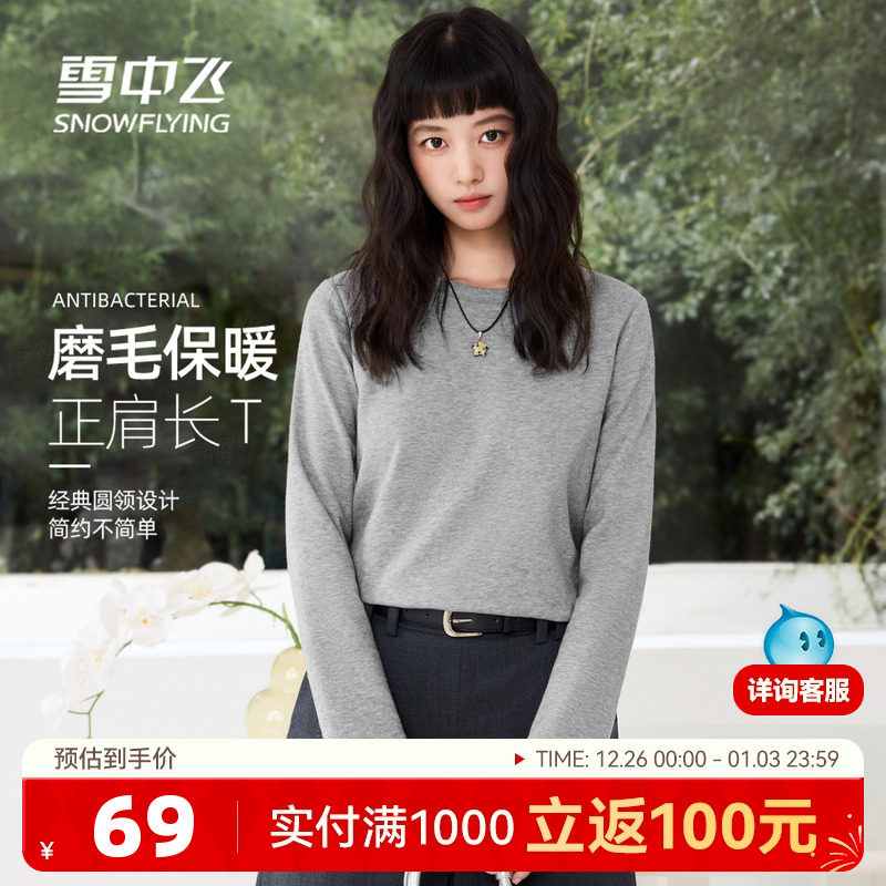 雪中飞正肩长袖t恤女春秋内搭上衣2026新款女士圆领磨毛打底衫PC