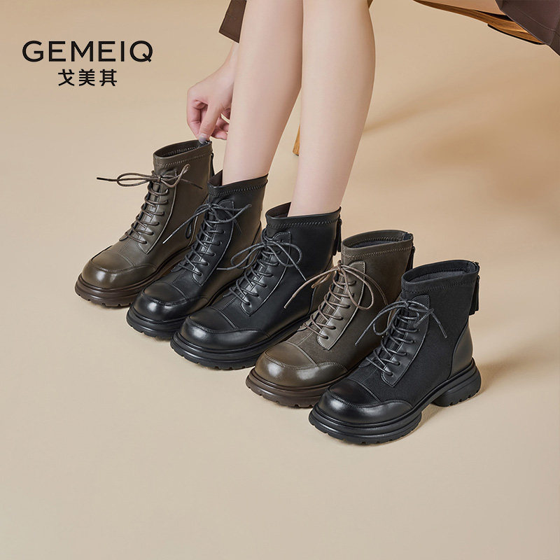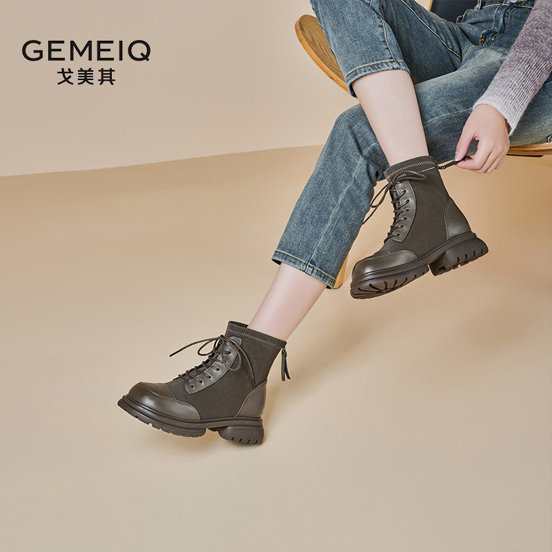 戈美其粗跟马丁靴女2024年春季新款系带短筒瘦瘦靴英伦风厚底短靴
