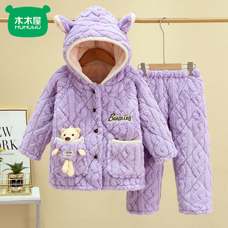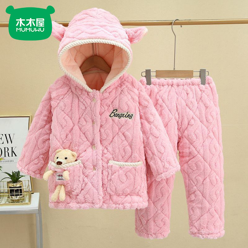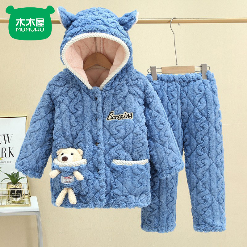 木木屋儿童睡衣冬季加厚三层夹棉加绒中大童男女保暖家居服外穿